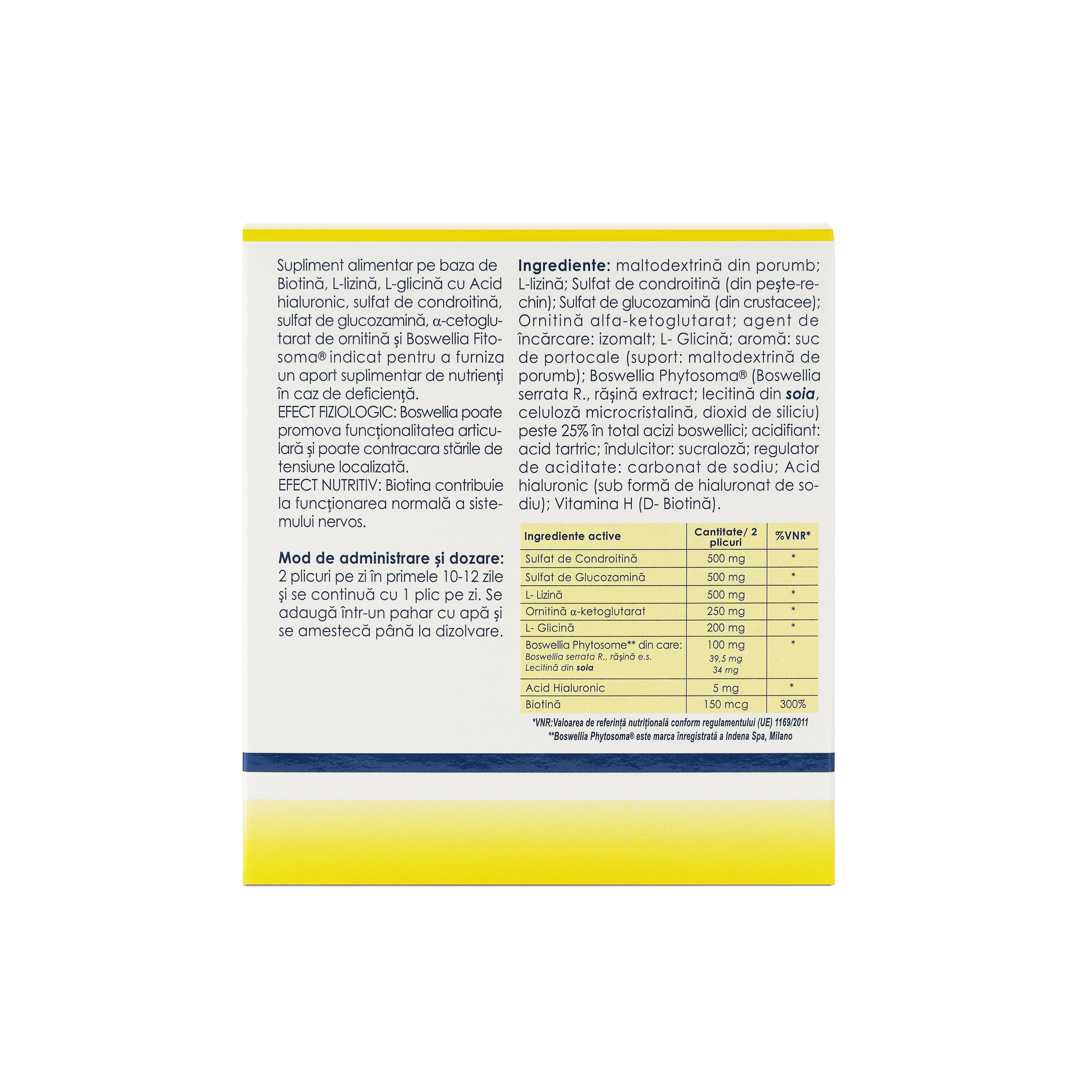 Supliment alimentar pe baza de Biotină, L-lizină, L-glicină cu Acid hialuronic, sulfat de condroitină, sulfat de glucozamină, α-cetoglutarat de ornitină și Boswellia Phytosome® indicate pentru a furniza un aport suplimentar de nutrienți în caz de deficiență.