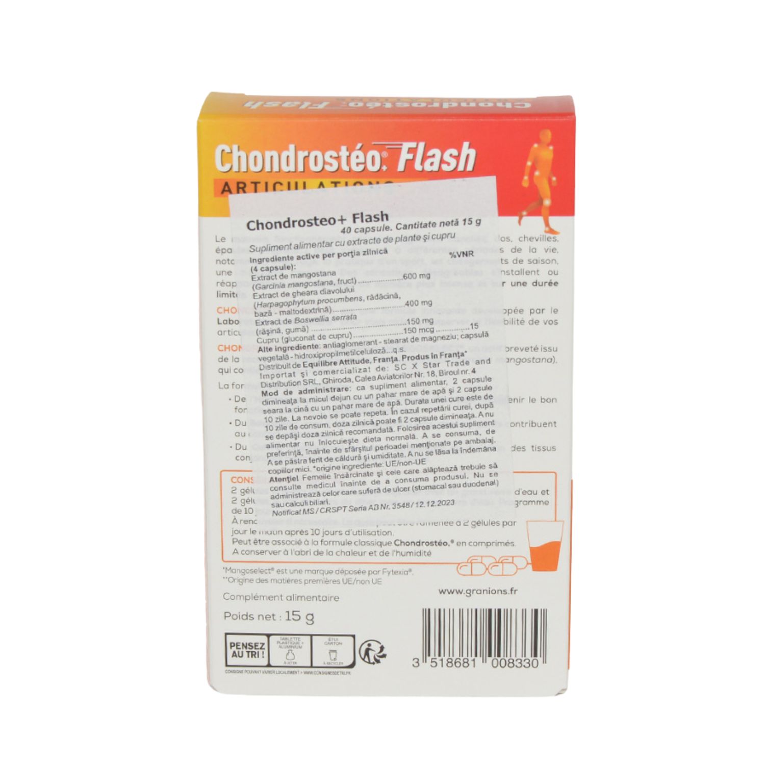 Chondrosteo+ Flash combină extracte vegetale și cupru, ingrediente atent selecționate pentru susținerea confortului articular și a mobilității. Mangoselect, ingredient brevetat obținut din mangostană, este bogat în compuși antioxidanți și contribuie la protejarea celulelor împotriva stresului oxidativ.