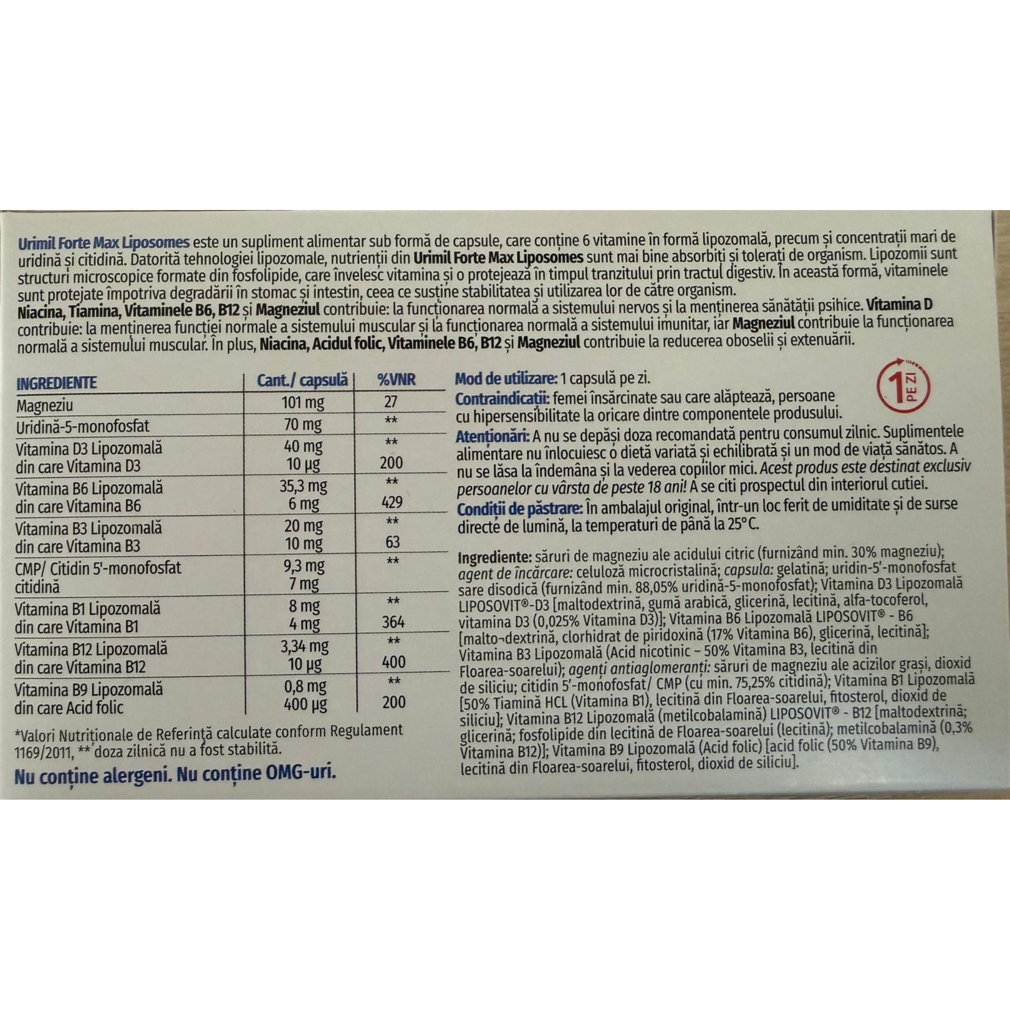 Supliment alimentar sub forma de capsule ce contine vitamine in forma lipozomala si uridina, citidina, magneziu. Tehnologia lipozomala protejeaza nutrientii de degradarea gastrica si sustine absorbtia crescuta si toleranta digestiva.