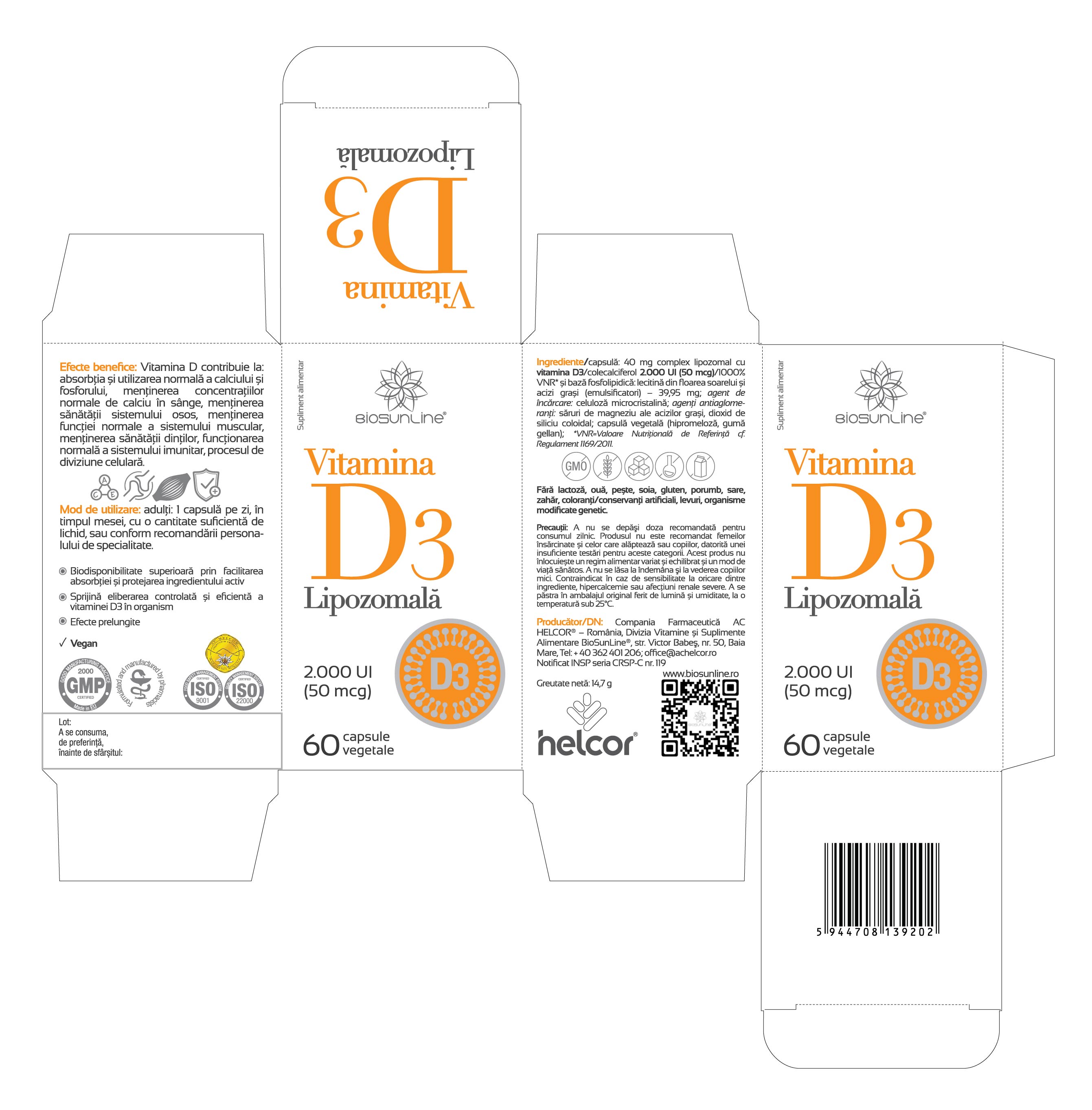 40 mg complex lipozomal cu vitamina D3/colecalciferol 2.000 UI (50 mcg)/1000%VNR* și bază fosfolipidică: lecitină din floarea soarelui și acizi grași (emulsificatori) – 39,95 mg; agent de încărcare: celuloză microcristalină; agenţi antiaglomeranţi: săruri de magneziu ale acizilor grași, dioxid de siliciu coloidal; capsulă vegetală (hipromeloză, gumă gellan); *VNR=Valoare Nutriţională de Referinţă cf. Regulament 1169/2011).