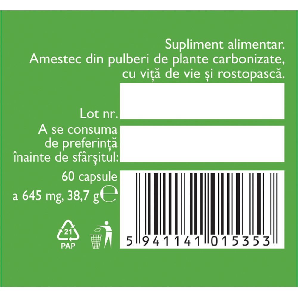 pulbere carbonizată din: crenguțe de viță de vie (Vitis viniferae lignum cum cortex) 176,8 mg, sâmburi de măslin (Oleae semen) 85,8 mg, semințe de struguri (Vitis viniferae semen) 85,8 mg, partea aeriană de rostopască (Chelidonii herba) 85,8 mg, rizomi de stevia stânelor (Rumex alpinus) 85,8 mg; gelatină (capsulă).