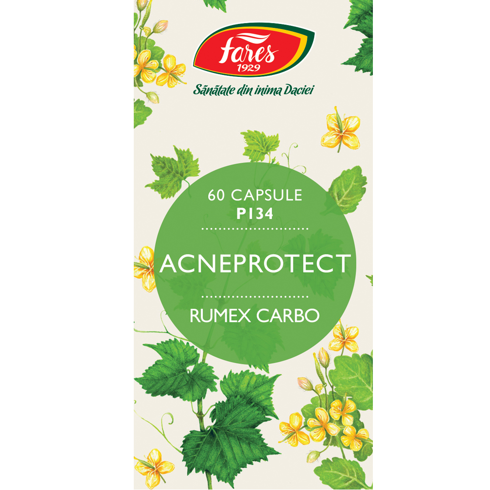 Suplimentul alimentar Acneprotect Rumex Carbo de la Fares 1929 este un complex mineralizant sub formă de capsule, bazat pe o rețetă tradițională. Formula sa, ce include ingrediente precum frunze de struguri și rostopască, este concepută pentru a contribui la menținerea sănătății pielii.