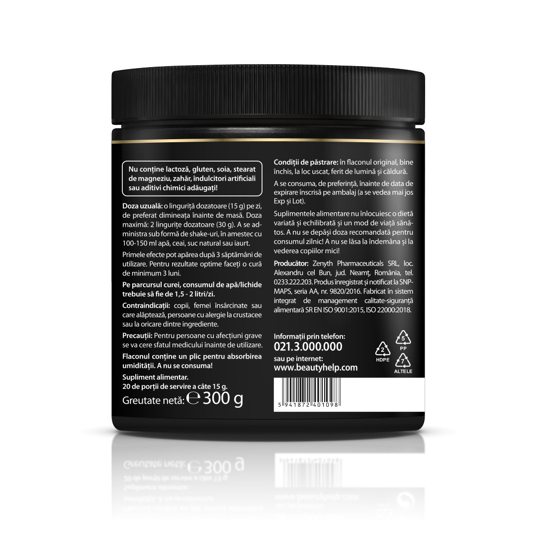 Per porție (15 g): colagen – 8000 mg; acid hialuronic – 40 mg; ceramide – 30 mg; trans-resveratrol – 40 mg; vitamina E – 3,37 mg (5 UI); astaxantină – 1 mg; coenzima Q10 – 30 mg; vitamina C – 1000 mg; OptiMSM® – 500 mg; glucozamină – 500 mg; fibre prebiotice (inulină și FOS) – 2,93 g.