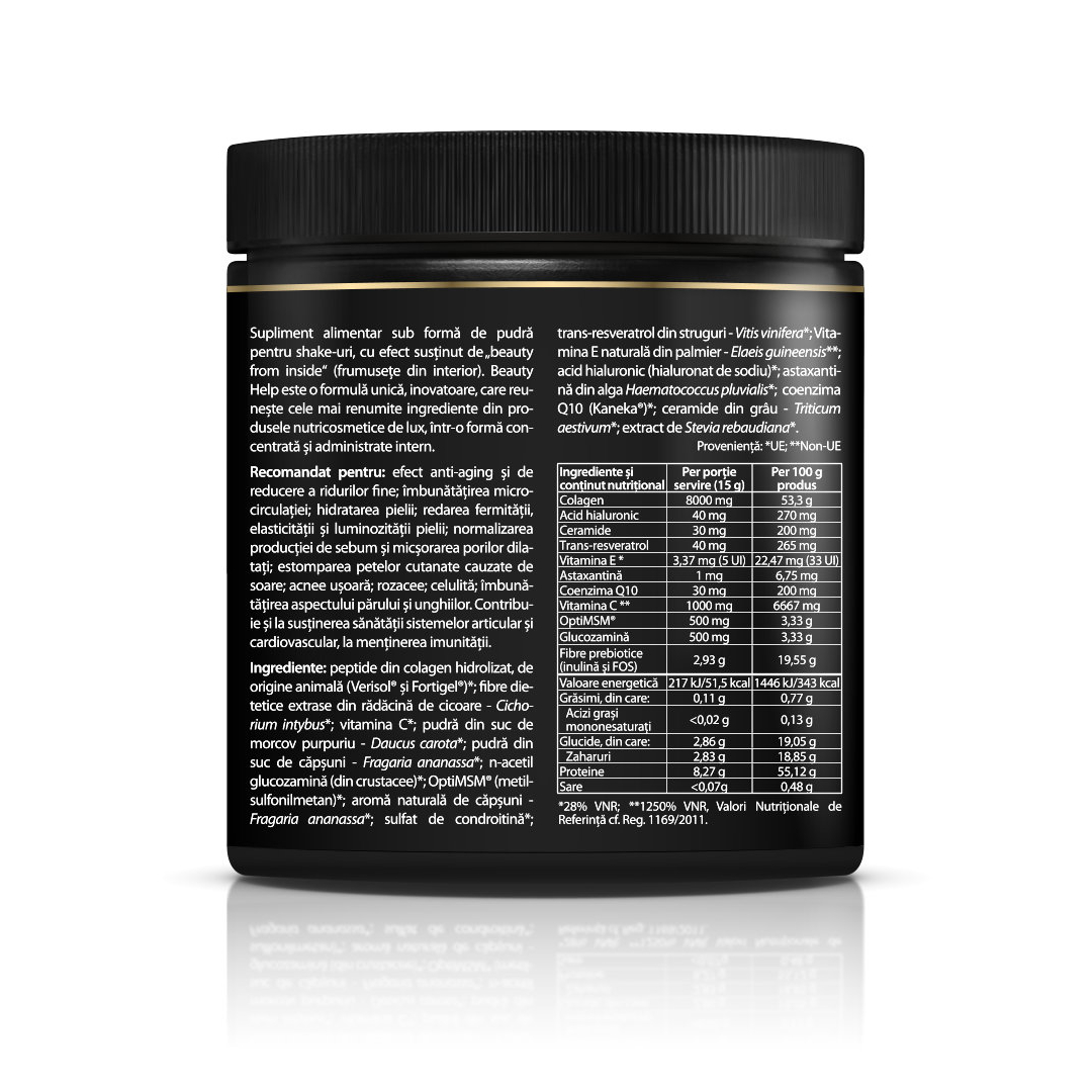 Supliment alimentar sub formă de pudră pentru shake-uri, cu efect susținut de „beauty from inside” (frumusețe din interior). Formula reunește ingrediente utilizate în produse nutricosmetice, într-o formă concentrată administrată intern, precum peptide din colagen hidrolizat, acid hialuronic, ceramide, trans-resveratrol, vitamina E, astaxantină și coenzima Q10.