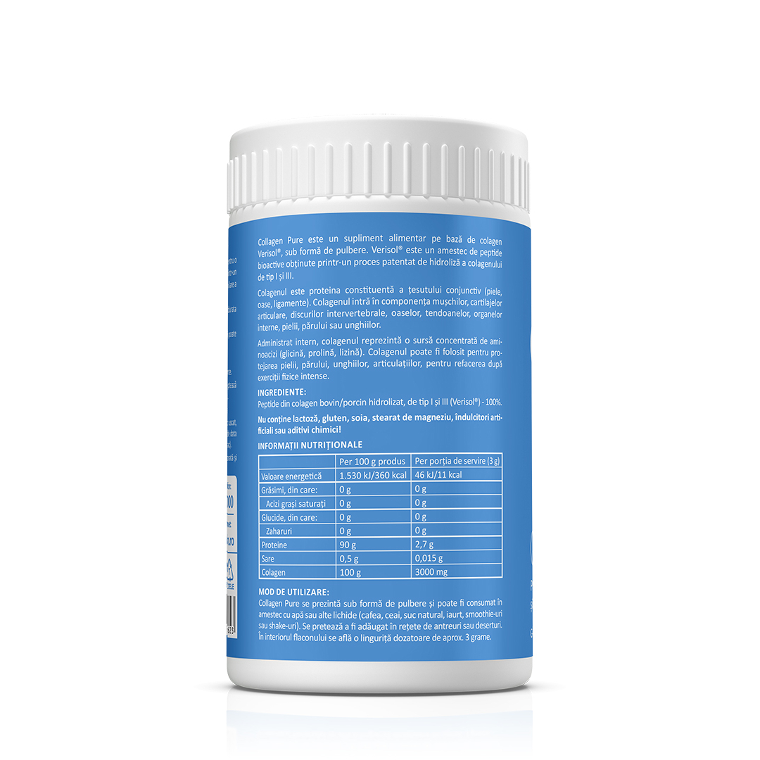 Supliment alimentar cu colagen hidrolizat tip I și III (Verisol®), sub formă de pulbere pură, pentru aport zilnic de proteine și aminoacizi specifici colagenului.