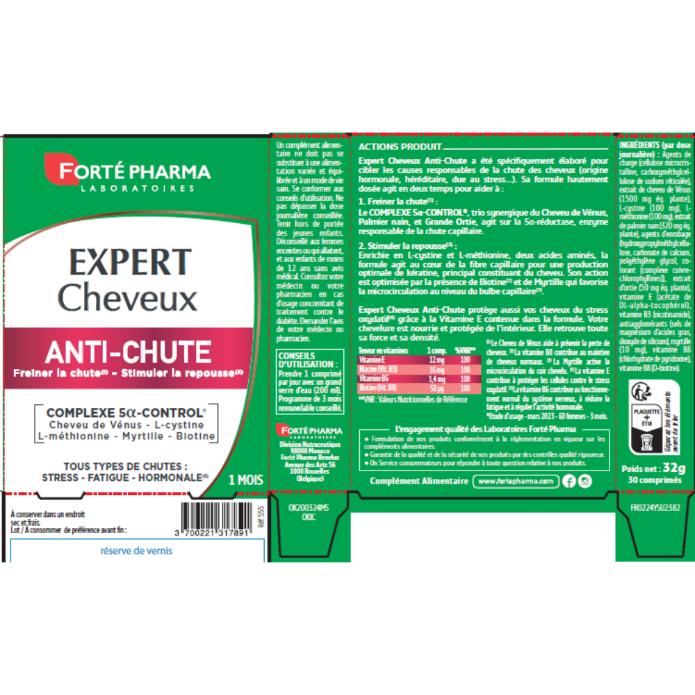Încetinește căderea părului1: complexul 5-α-control: feriga venus1, palmierul pitic și urzica acționează asupra enzimei 5-α-reductazei responsabile de căderea părului.