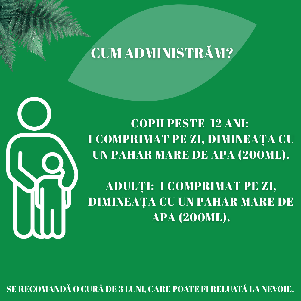 Mod de utilizare adulți și copii peste 12 ani: 1 comprimat pe zi, dimineața cu un pahar mare de apa (200ml). Se recomandă o cură de 3 luni, care poate fi reluată la nevoie.