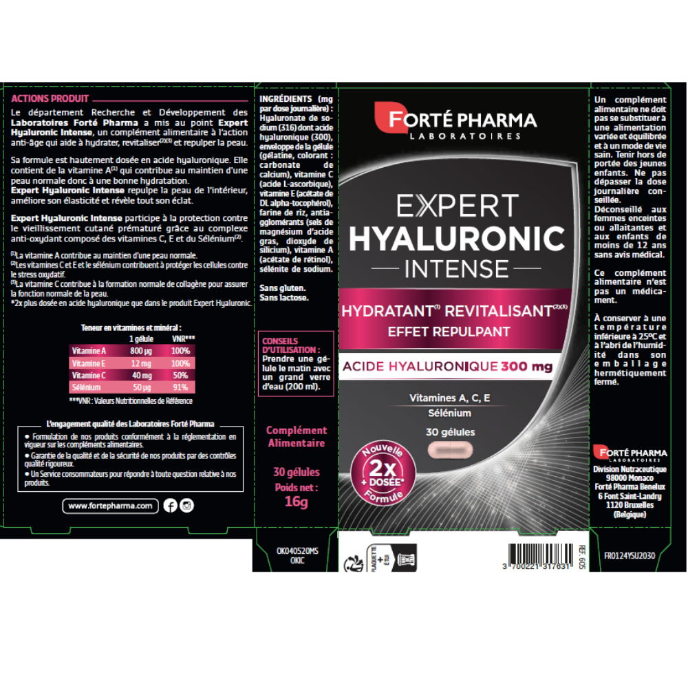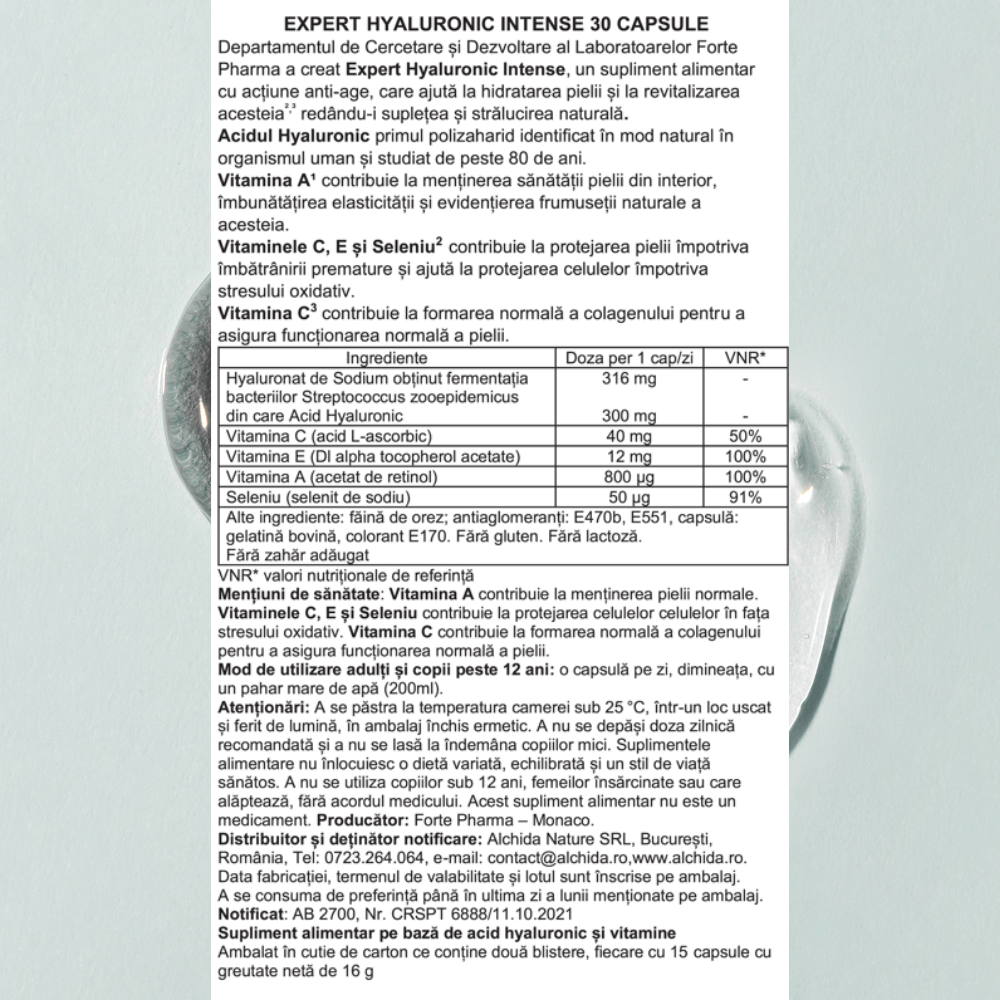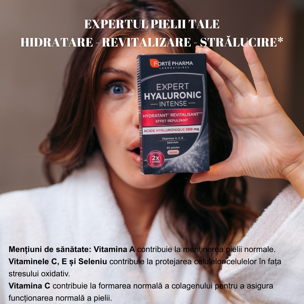 Departamentul de Cercetare și Dezvoltare al Laboratoarelor Forte Pharma a creat Expert Hyaluronic Intense, un supliment alimentar cu acțiune anti-age, care ajută la hidratarea pielii și la revitalizarea acesteia²,³ redându-i suplețea și strălucirea naturală.