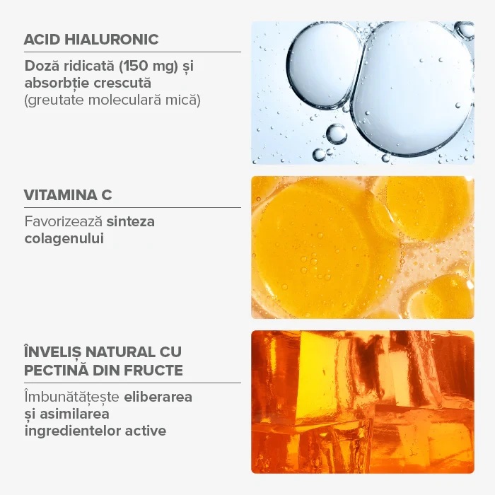Acest supliment alimentar combină acidul hialuronic și vitamina C pentru a sprijini sănătatea pielii, menținând-o hidratată, fermă și elastică. Formula contribuie la prevenirea semnelor premature de îmbătrânire și la susținerea sănătății generale a pielii.