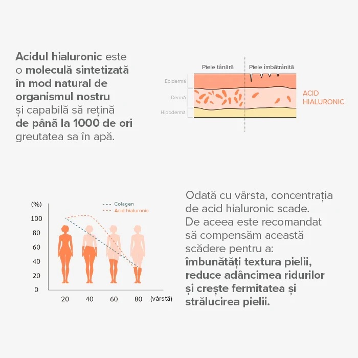 Acid hialuronic – reține apa în țesuturi, menținând hidratarea și elasticitatea pielii.