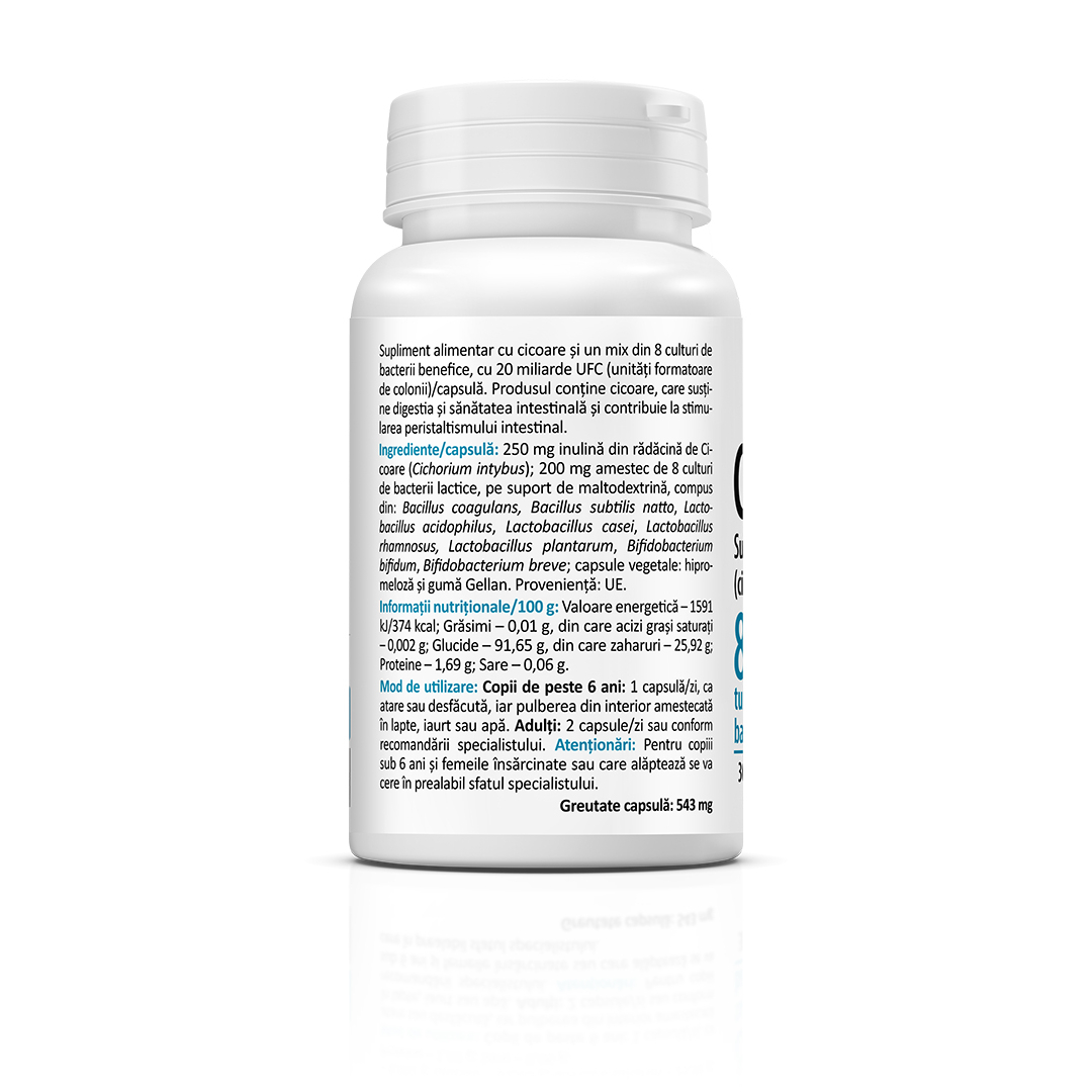 Supliment alimentar cu inulină din cicoare și complex de 8 culturi probiotice, pentru susținerea echilibrului florei intestinale și a digestiei.