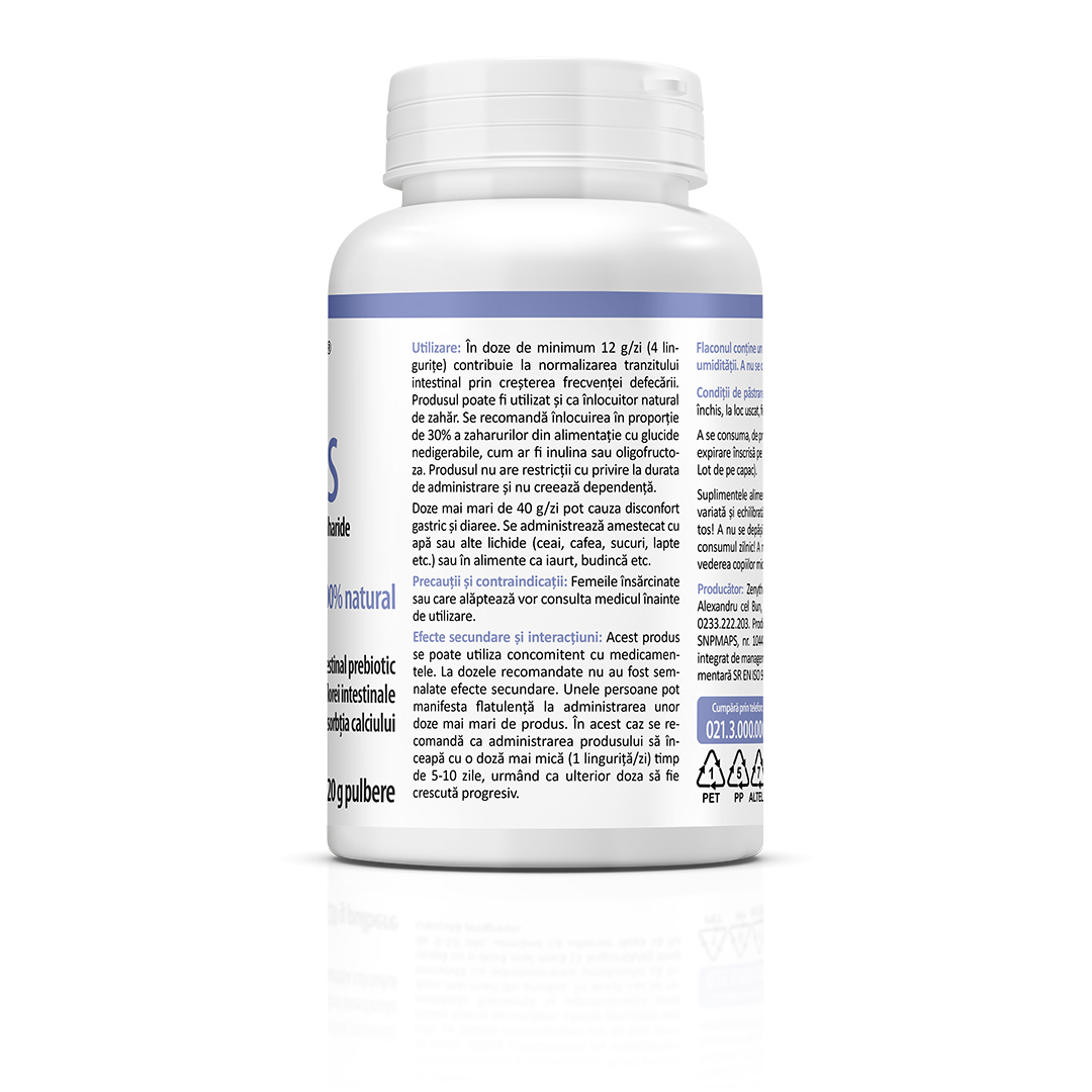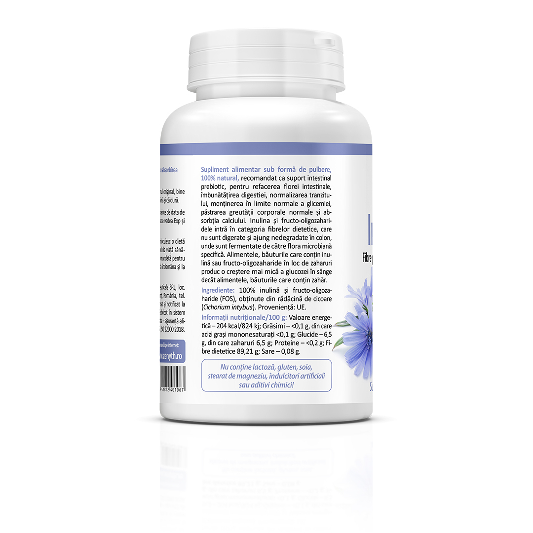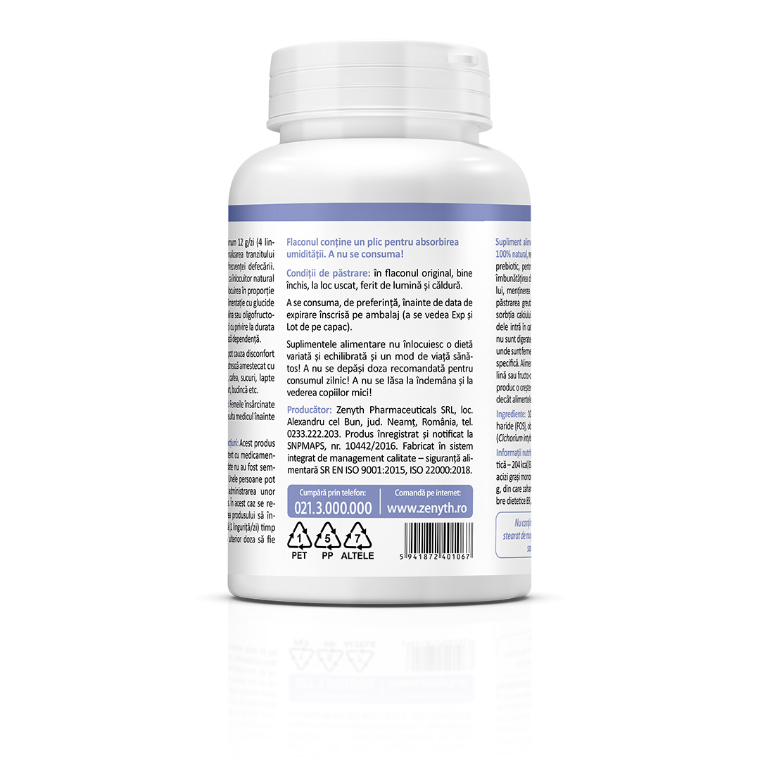 Supliment alimentar sub formă de pulbere, 100% natural, pe bază de inulină și fructo-oligozaharide (FOS), destinat completării aportului de fibre alimentare și susținerii funcției digestive normale.