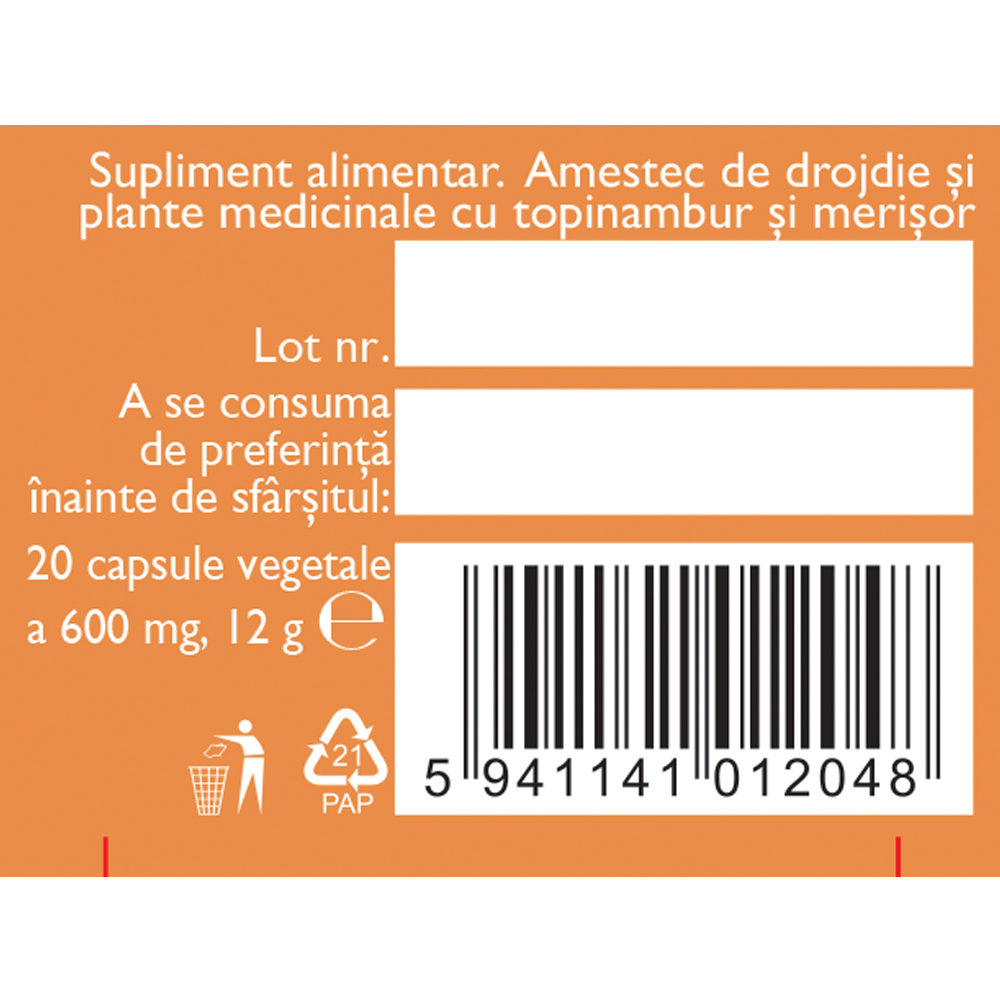 Pătlăgina contribuie la protejarea echilibrului florei intestinale, iar formula este îmbogățită cu topinambur și merișor.