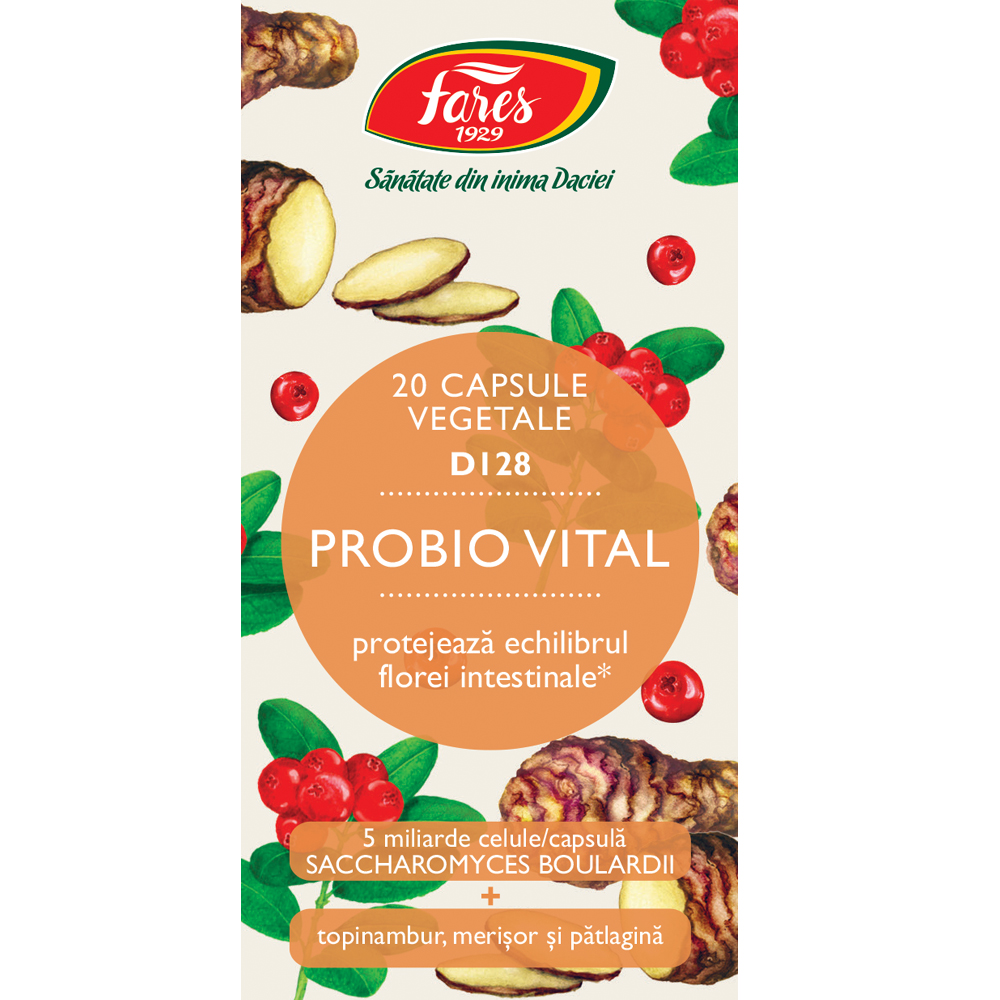 Suplimentul alimentar PROBIO VITAL de la Fares 1929 este o formulă pe bază de drojdie și plante, concepută pentru a susține echilibrul intern. Produsul combină Saccharomyces boulardii cu ingrediente vegetale precum topinambur, merișor și pătlăgină.