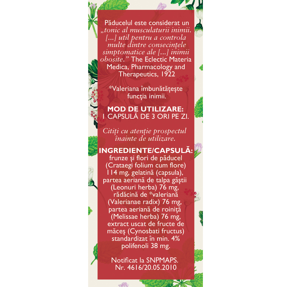 frunze si flori de paducel (Crataegi folium cum flore) 114 mg, gelatina (capsula), partea aeriana de talpa gastei (Leonuri herba) 76 mg, radacina de valeriana (Valerianae radix) 76 mg, partea aeriana de roinita (Melissae herba) 76 mg, extract uscat de fructe de macese (Cynosbati fructus) standardizat in min. 4% polifenoli 38 mg