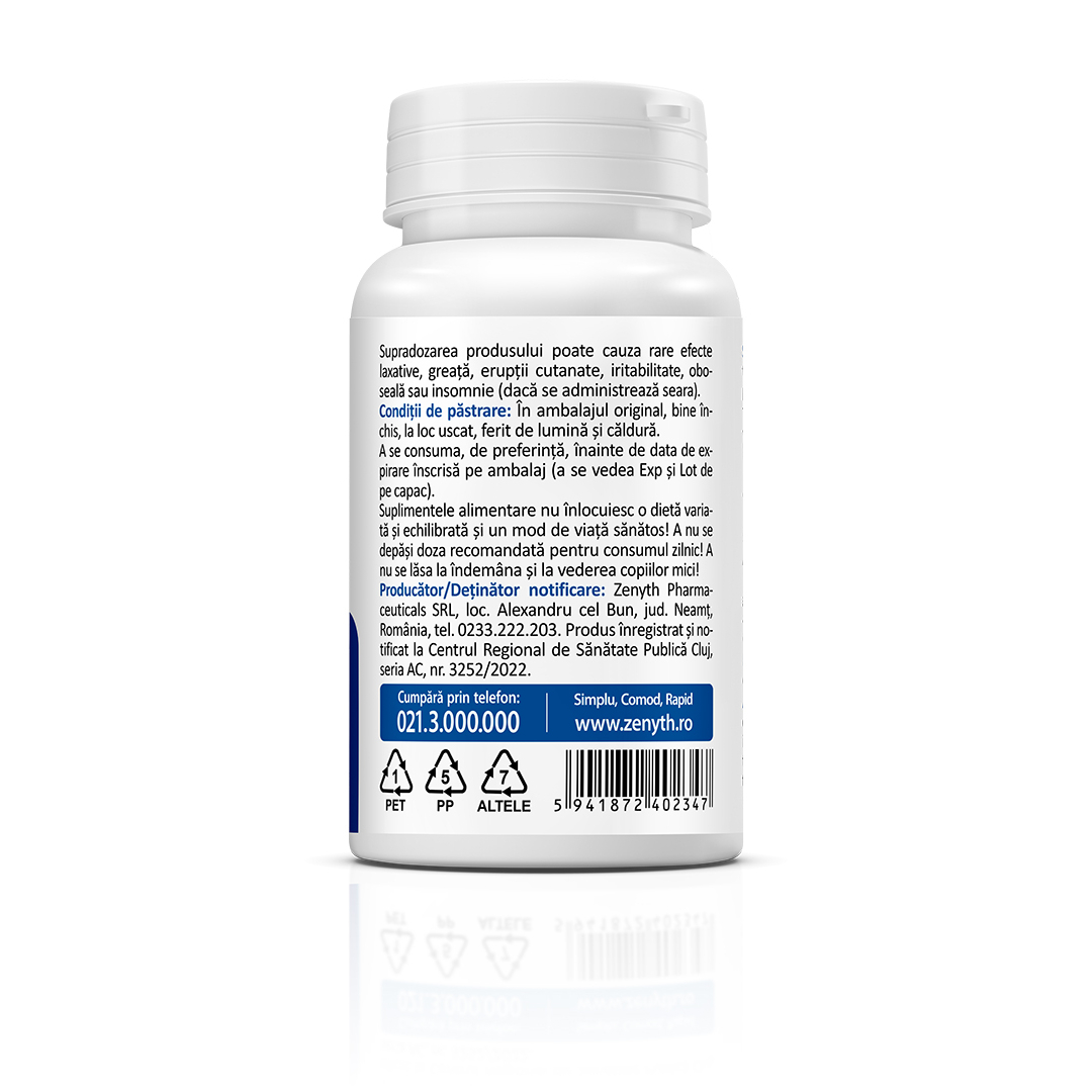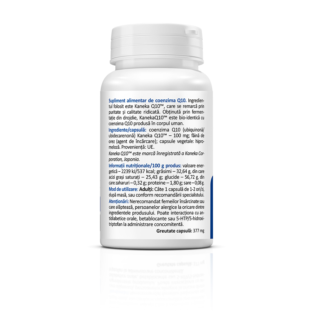 Supliment alimentar cu Coenzima Q10 Kaneka Q10™, 100 mg/capsulă, obținută prin fermentație, într-o formă bio-identică cu cea prezentă în organism.