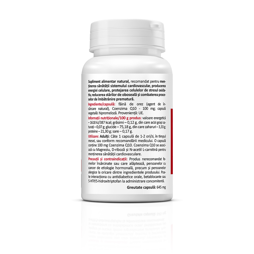Supliment alimentar cu Coenzima Q10 (100 mg/capsulă), pentru aport zilnic și integrare în rutina de susținere a energiei și stilului de viață activ.