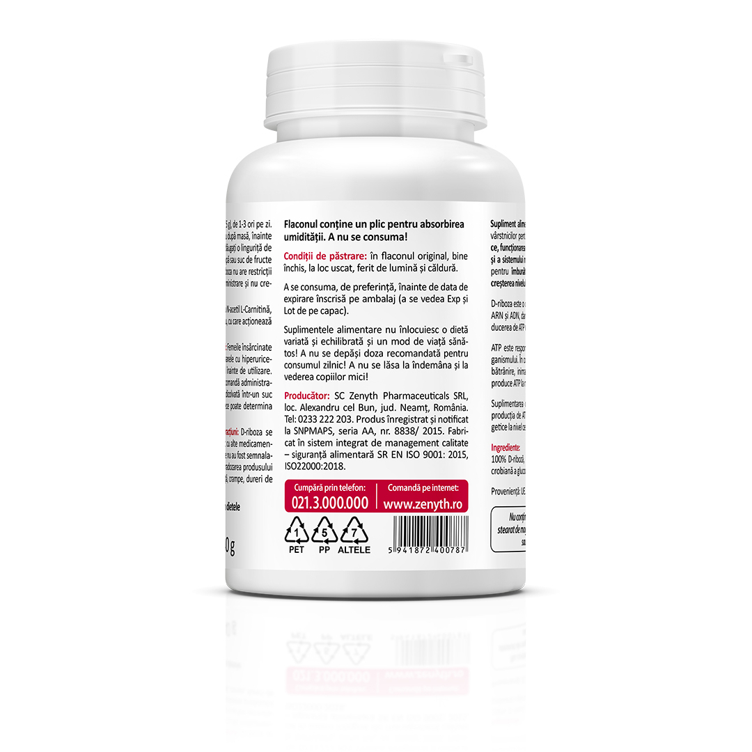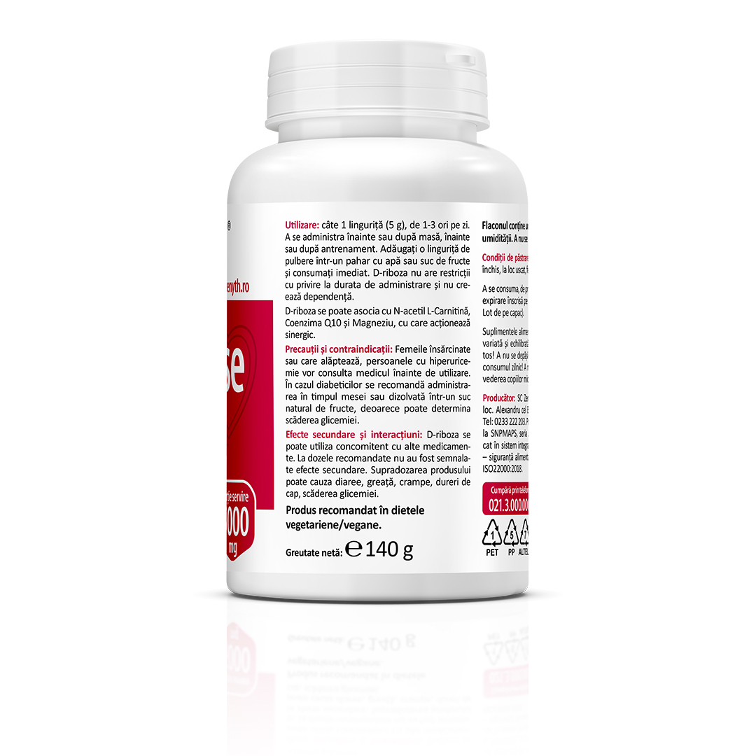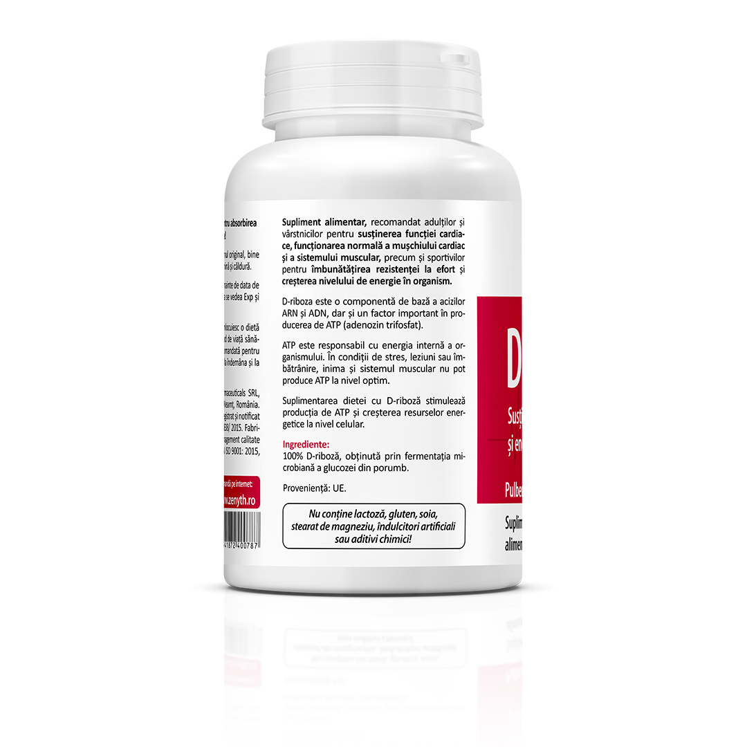 Supliment alimentar cu D-riboză, destinat susținerii funcției cardiace, producției de energie celulară și rezistenței la efort.