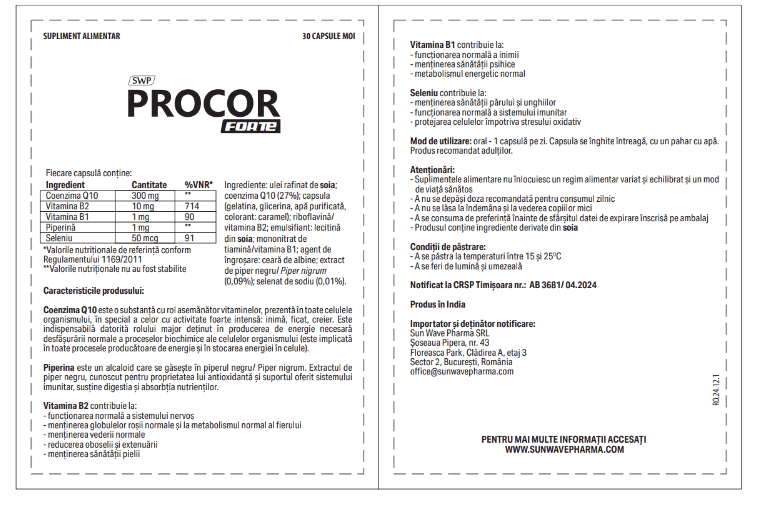 ulei rafinat de soia; coenzima Q10 (27%); capsula (gelatină, glicerină, apă purificată, colorant: caramel); riboflavinǎ/ vitamina B2 (1%); emulsifiant: lecitină din soia; mononitrat de tiaminǎ/vitamina B1 (0,1%); agent de îngroşare: ceară de albine; extract de piper negru/ Piper nigrum (0,09%); selenat de sodiu (0,01%).