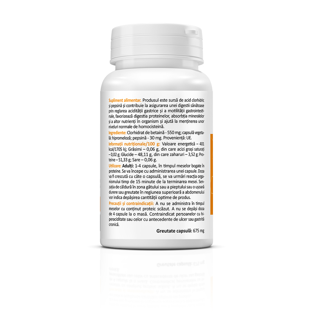 Supliment alimentar ce conține clorhidrat de betaină și pepsină, contribuind la asigurarea unei digestii sănătoase prin reglarea acidității gastrice și a motilității gastrointestinale. Produsul favorizează digestia proteinelor, absorbția mineralelor și a altor nutrienți în organism și contribuie la menținerea unor niveluri normale de homocisteină.