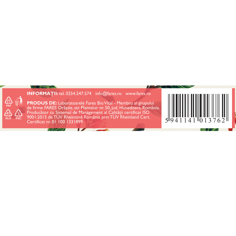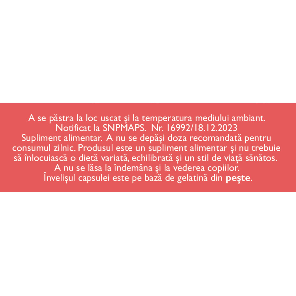 A nu se depăși doza recomandată pentru consumul zilnic. Produsul este un supliment alimentar și nu trebuie să înlocuiască o dietă variată, echilibrată și un stil de viață sănătos. A se păstra la loc uscat, la temperatura mediului ambiant și a nu se lăsa la îndemâna și la vederea copiilor mici.