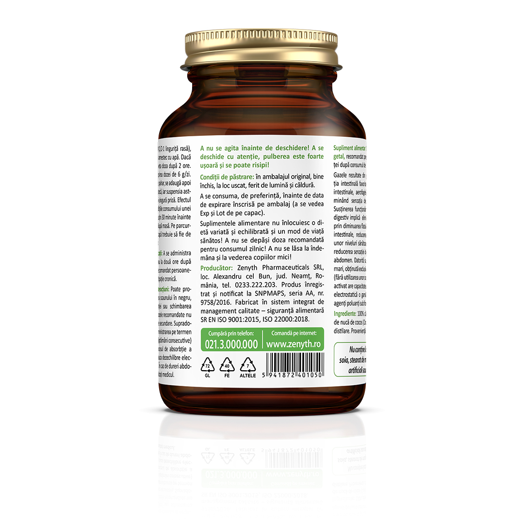 Supliment alimentar 100% natural și 100% vegetal, recomandat pentru reducerea flatulenței după consumul de alimente. Gazele rezultate din fermentația și putrefacția intestinală pot favoriza apariția balonărilor intestinale, aerofagiei și meteorismului, determinând senzația de disconfort abdominal. Susținerea funcționării normale a sistemului digestiv implică eliminarea acestor disconforturi prin diminuarea flatulenței generate de gazele intestinale, reducerea toxinelor, menținerea unor niveluri sănătoase ale pH-ului intestinal și reducerea senzației de greutate și presiune în abdomen.