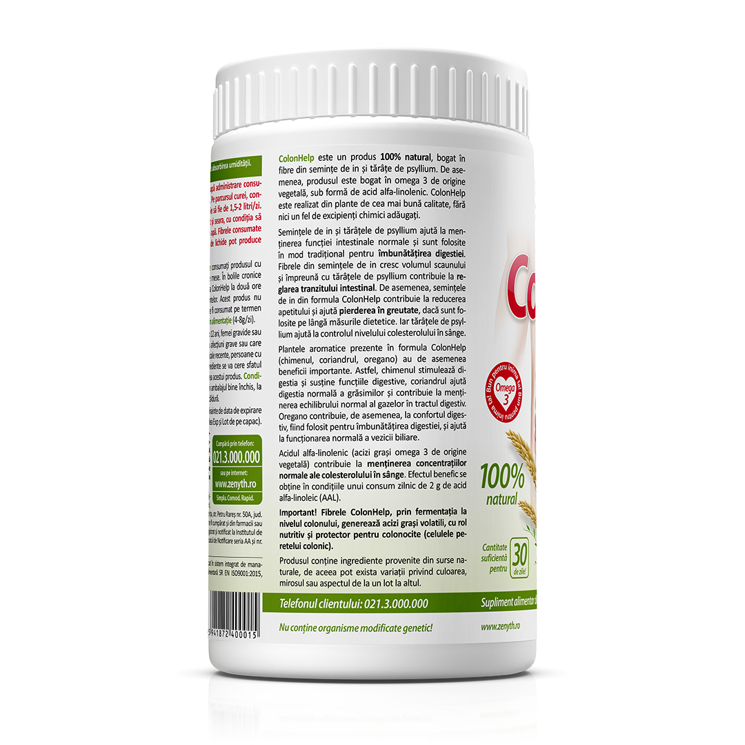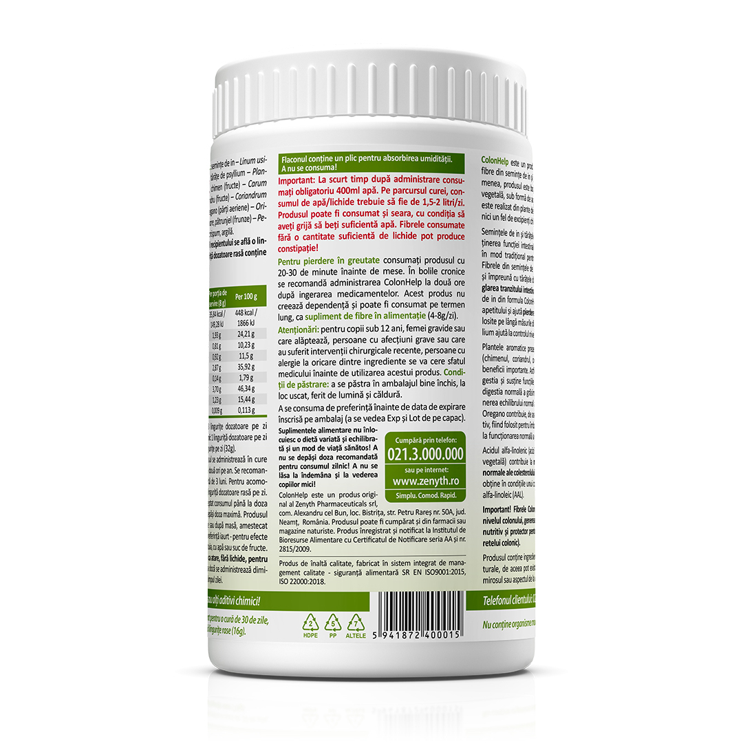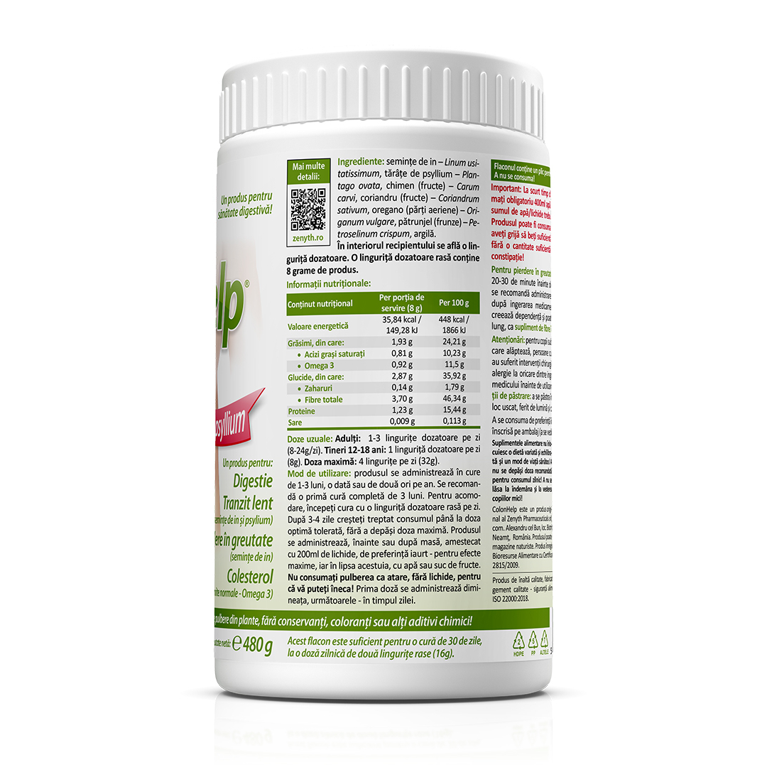 Supliment alimentar cu fibre din semințe de in și psyllium, formulă naturală pentru susținerea digestiei și a tranzitului intestinal, ColonHelp 480 g.