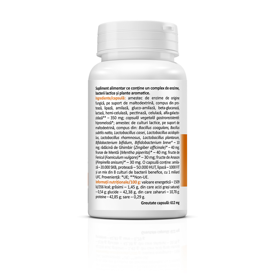 amestec de enzime de origine fungică (protează, lipază, amilază, gluco-amilază, beta-glucanază, lactază, hemi-celulază, pectinază, celulază, alfa-galactozidază) – 350 mg; amestec de culturi lactice (bacillus coagulans, bacillus subtilis natto, lactobacillus casei, lactobacillus acidophilus, lactobacillus rhamnosus, lactobacillus plantarum, bifidobacterium bifidum, bifidobacterium breve) – 10 mg; rădăcină de ghimbir (zingiber officinale) – 40 mg; frunze de mentă (mentha piperita) – 40 mg; fructe de fenicul (foeniculum vulgare) – 30 mg; fructe de anason (pimpinella anisum) – 30 mg; capsulă vegetală gastrorezistentă: hipromeloză