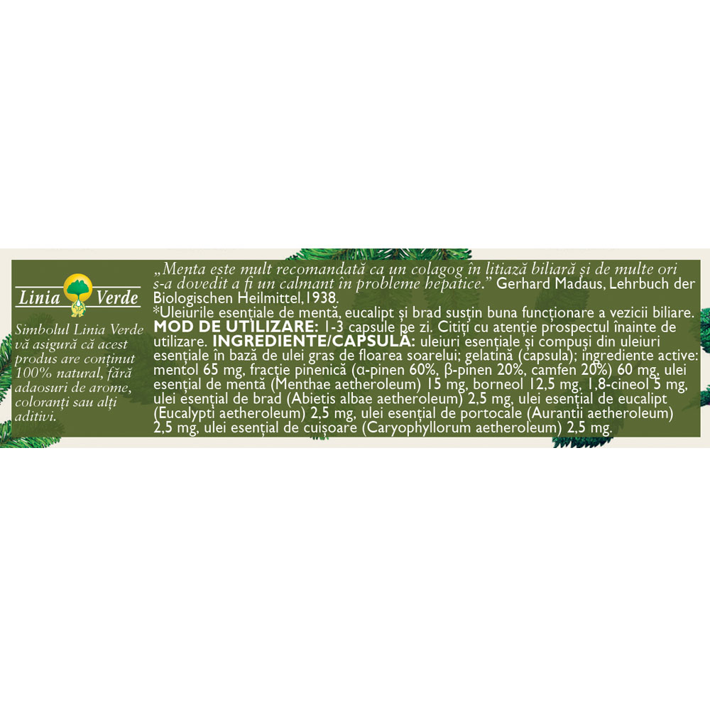 uleiuri esențiale și compuși din uleiuri esențiale în baza de ulei gras de floarea soarelui; gelatină (capsulă); ingrediente active: ulei esențial de mentă (Menthae aetheroleum) 15 mg, borneol 12,5 mg, 1,8-cineol 5 mg, ulei esențial de brad (Abietis albae aetheroleum) 2,5 mg, ulei esențial de eucalipt (Eucalypti aetheroleum) 2,5 mg, ulei esențial de portocale (Aurantii aetheroleum) 2,5 mg, ulei esențial de cuișoare (Caryophyllorum aetheroleum) 2,5 mg
