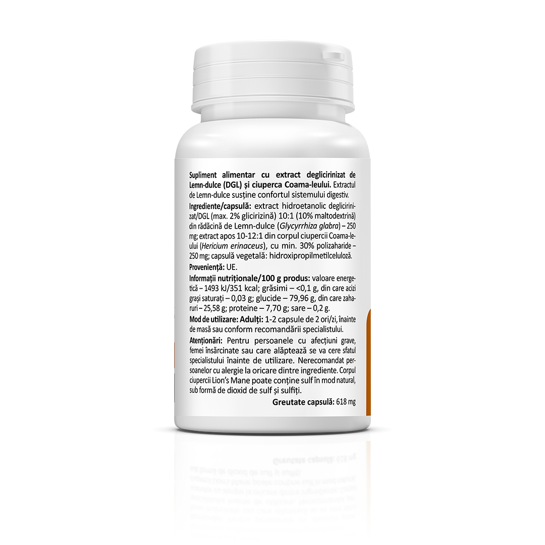 Supliment alimentar cu extract deglicirinizat de lemn-dulce (DGL) și extract din ciuperca Coama-leului (Hericium erinaceus), destinat completării dietei zilnice cu ingrediente de origine naturală.
