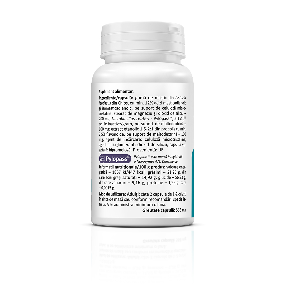 Supliment alimentar pe bază de gumă de mastic, Lactobacillus reuteri (Pylopass™) și extract de propolis, destinat completării dietei zilnice cu ingrediente din surse naturale.