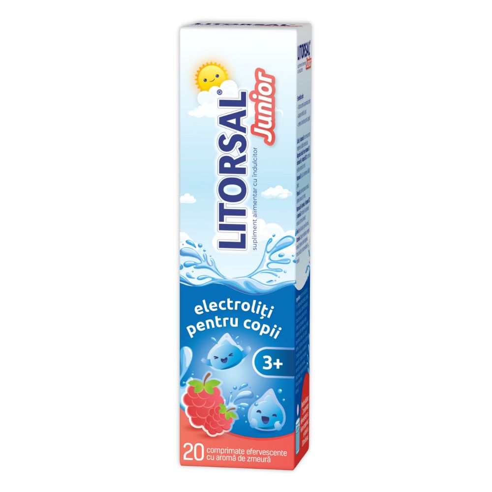 Litorsal Junior este un supliment alimentar aromă de zmeură ce conține electroliți