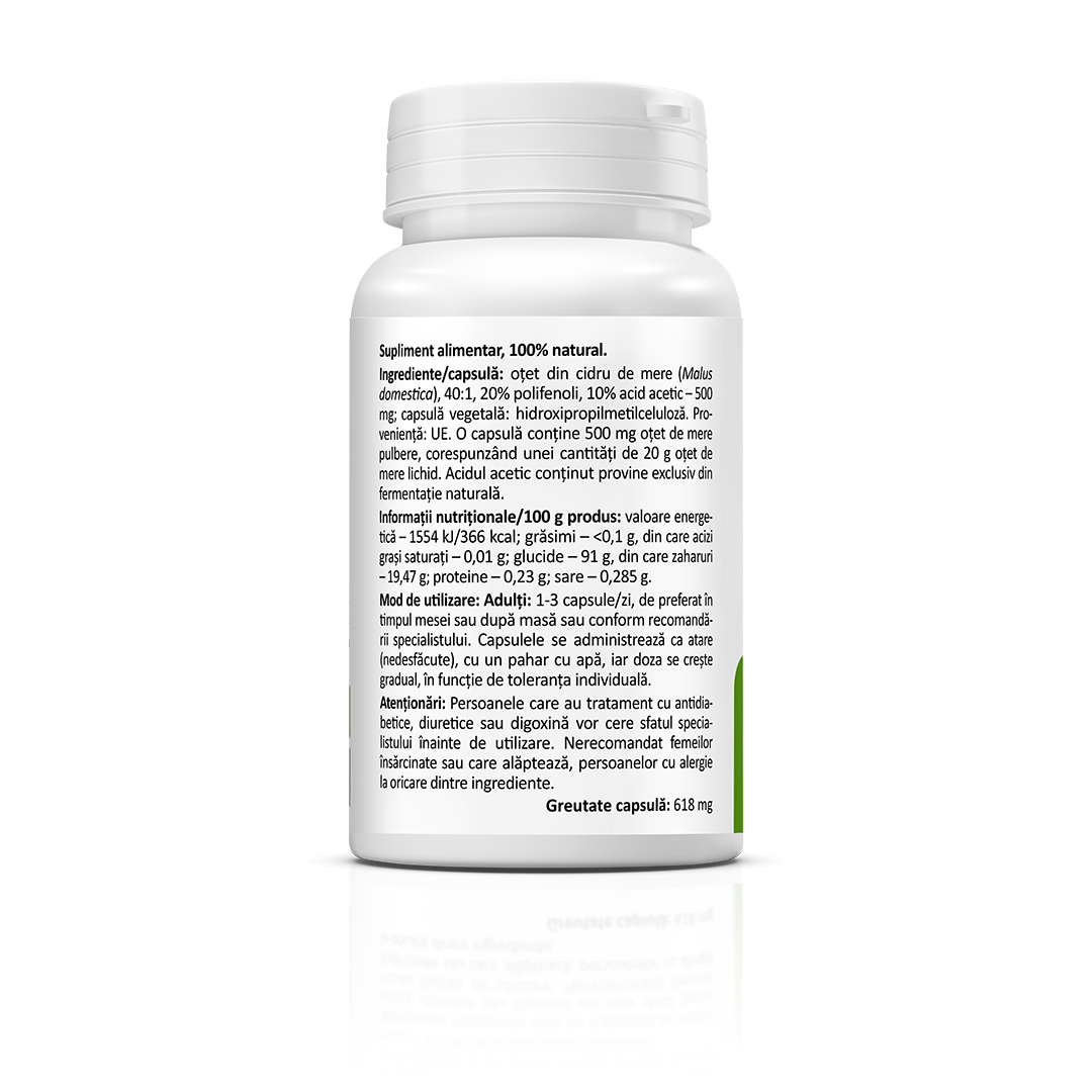 oÈ›et din cidru de mere (malus domestica), 40:1, 20% polifenoli, 10% acid acetic – 500 mg; capsulă vegetală: hidroxipropilmetilceluloză.