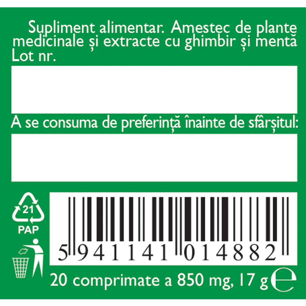 fructoză, extract uscat de acerola (Malpighia glabra) standardizat în min. 25% vitamina C 85 mg, rizomi de ghimbir (Zingiberis rhizoma) 37 mg, fructe de fenicul (Foeniculi fructus) 18,5 mg, frunze de rozmarin (Rosmarini folium) 15,7 mg, măghiran (Majoranae herba) 9,2 mg, frunze de dafin (Lauri folium) 4,6 mg, ulei esențial de mentă (Menthae piperitae aetheroleum) 4,25 mg, ulei esențial de scorțișoară (Cinnamomi aetheroleum) 4,25 mg, ulei esențial de lămâie (Citri aetheroleum) 4,25 mg, ulei esențial de ghimbir (Zingiberis aetheroleum) 4,25 mg, lactoză, stearat de magneziu, aerosil.
