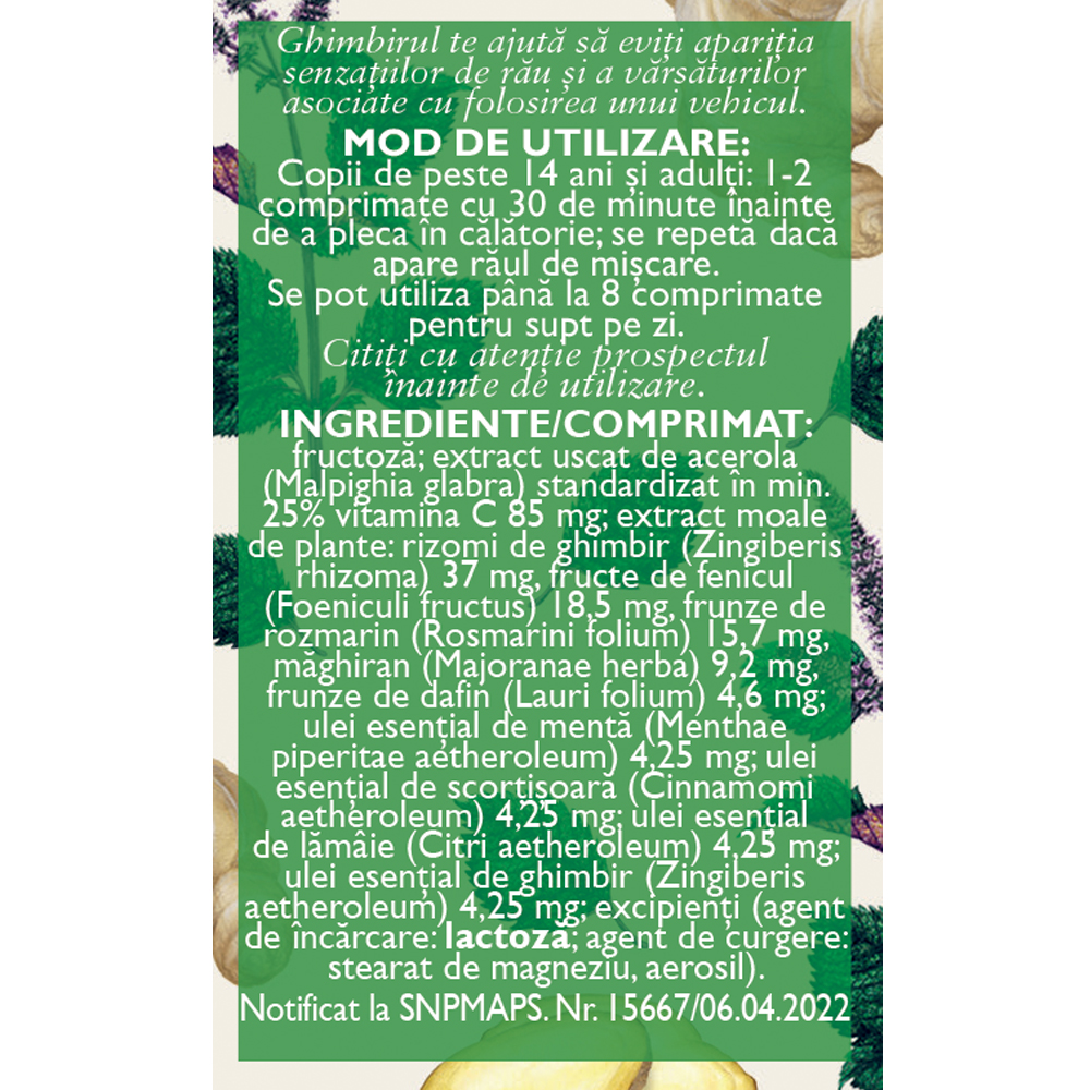 Are efect în reducerea senzaţiilor de rău şi a vărsăturilor în timpul călătoriilor cu mijloacele de transport, datorită conţinutului de ghimbir;