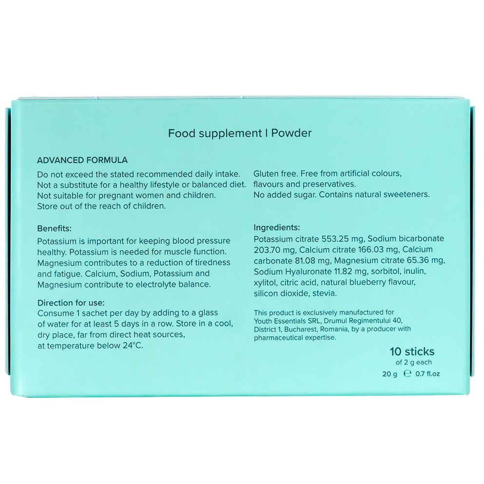 200 mg potasiu, 55 mg sodiu, 65 mg calciu, 10 mg magneziu, 10 mg acid hialuronic, sorbitol, xilitol, acid citric, aroma de coacaze, dioxid de siliciu, inulina, stevia.