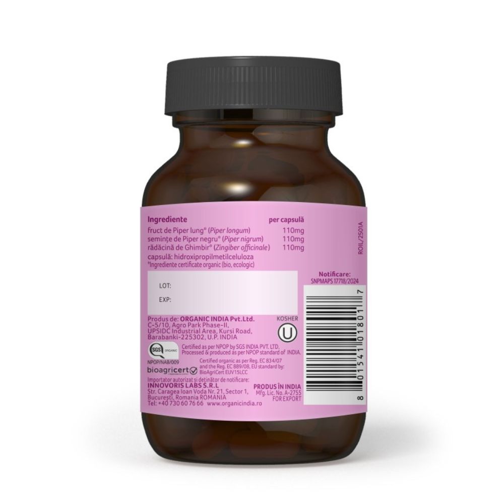 ORGANIC INDIA Trikatu, este un produs 100% Certificat Organic si nu contine organisme modificate genetic. Nu contine si nu sunt folosite in niciun stagiu al productiei pesticide sintetice, erbicide, ingrasaminte sau alte tratamente chimice.