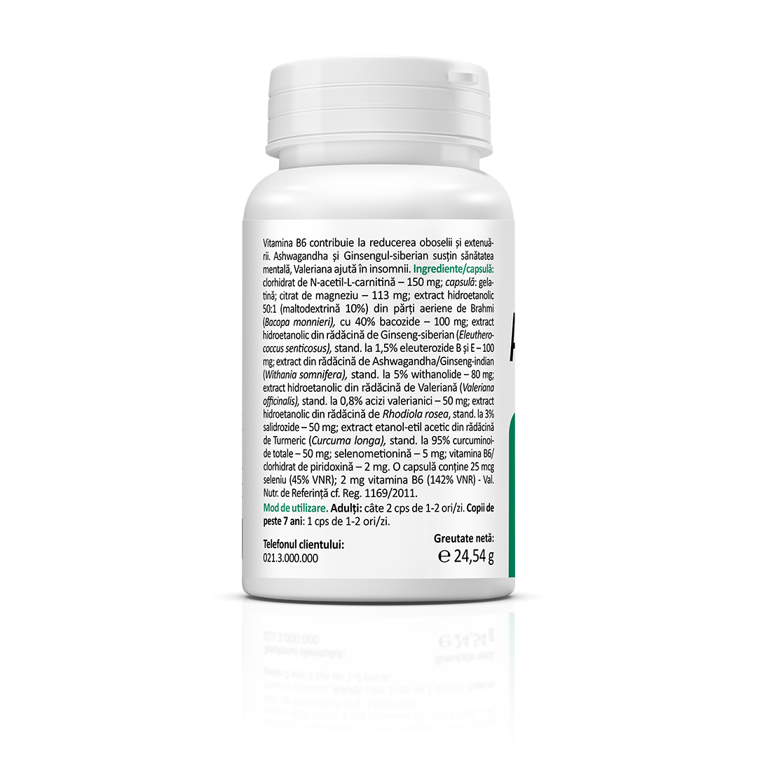 Vitamina B6 contribuie la reducerea oboselii și extenuării. Ashwagandha și Ginsengul-siberian susțin sănătatea mentală. Valeriana ajută în insomnii.
