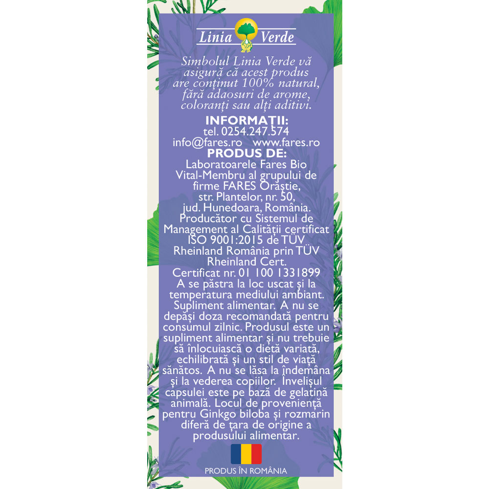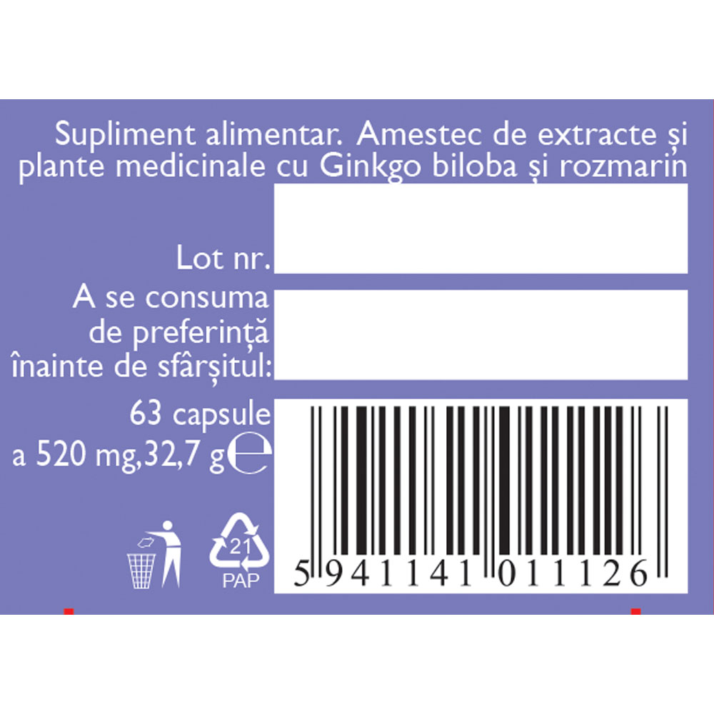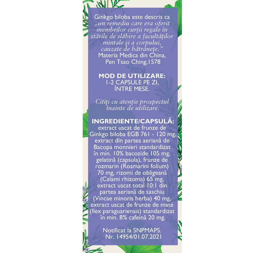 Supliment alimentar pe bază de plante medicinale, cu extracte standardizate de ginkgo biloba, bacopa, rozmarin și alte ingrediente vegetale. Formulat pentru a sprijini funcțiile cognitive și circulatorii prin aportul de principii active din plante.