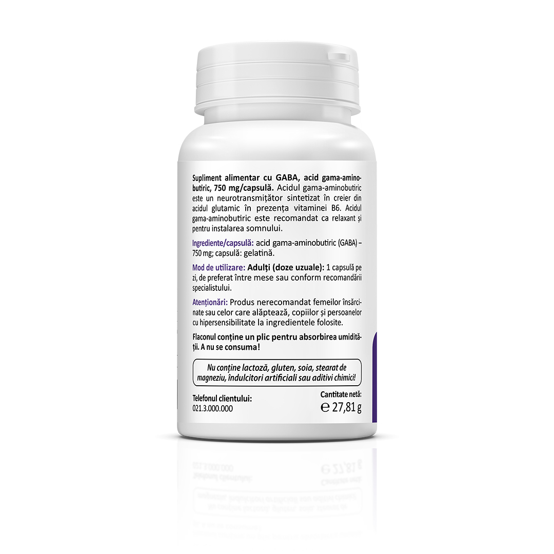 Supliment alimentar cu GABA (acid gama-aminobutiric) 750 mg/capsulă, recomandat pentru relaxare și susținerea instalării somnului.