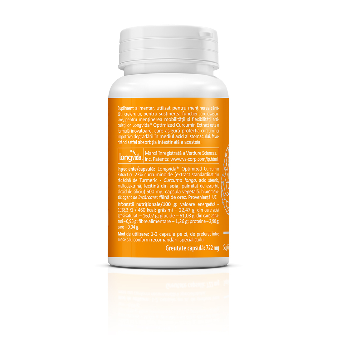 longvida® optimized curcumin extract cu 23% curcuminoide (extract standardizat din rădăcină de turmeric – curcuma longa, acid stearic, maltodextrină, lecitină din soia, palmitat de ascorbil, dioxid de siliciu), 500 mg; capsulă vegetală: hipromeloză; agent de încărcare: făină de orez