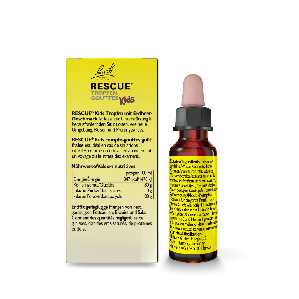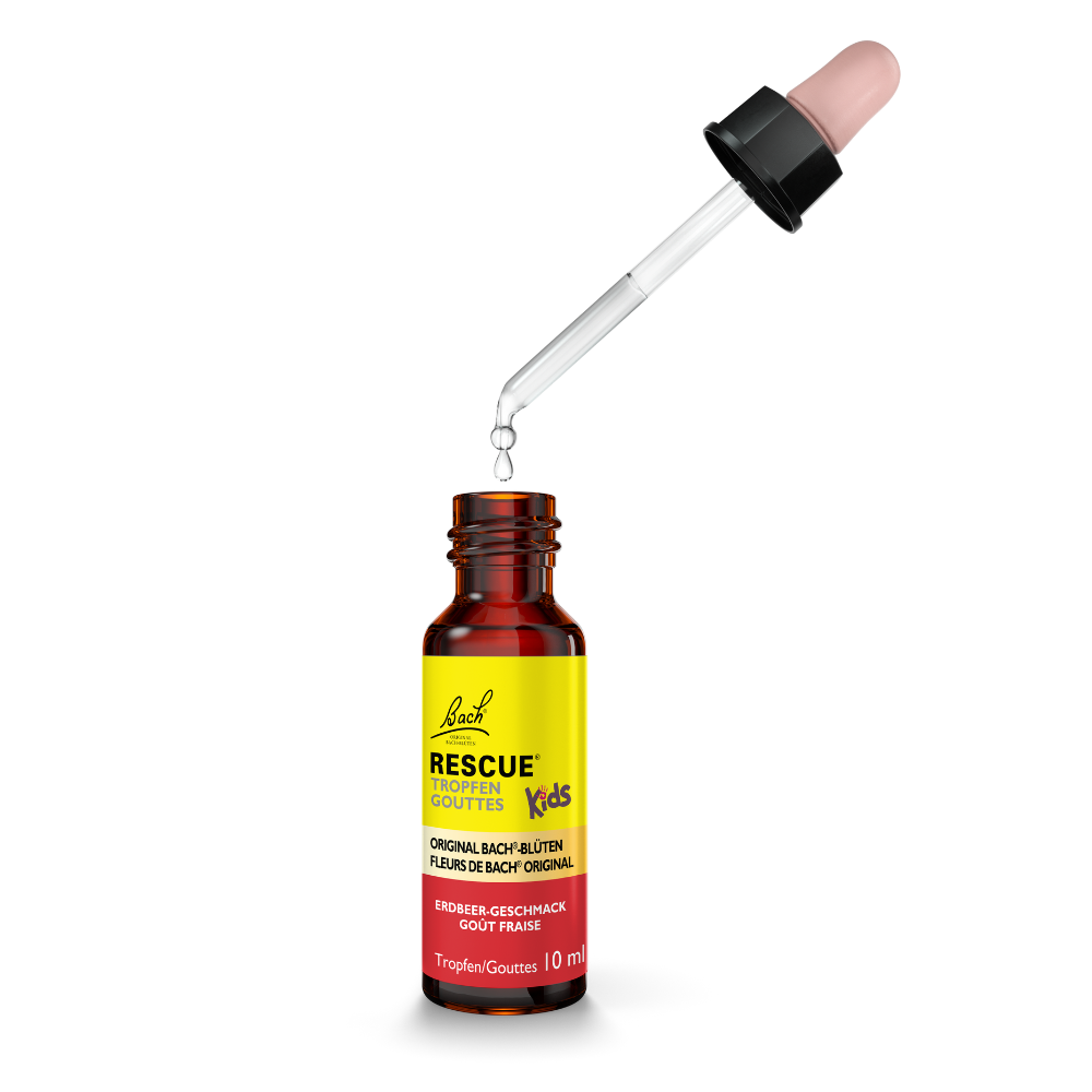 Picături vegane pe bază de esențe florale BACH®, potrivite pentru copii și aromatizate natural cu căpșune. Fără alcool și fără arome artificiale.