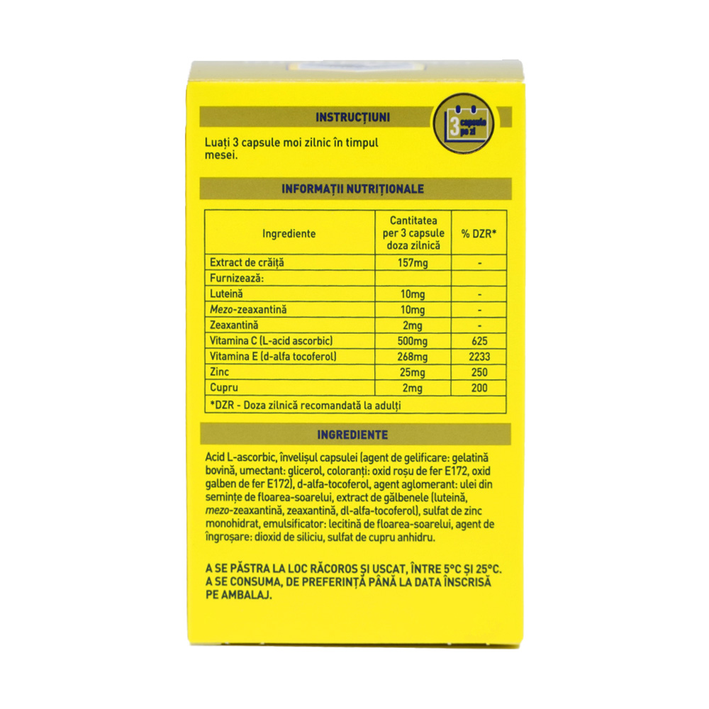 Acid L-ascorbic, învelișul capsulei (agent de gelificare: gelatină bovină, umectant: glicerină, coloranți: oxid roșu de fier E172, oxid galben de fier E172), d-alfa-tocoferol, agent aglomerant: ulei din semințe de floarea-soarelui, extract de gălbenele (luteină, mezo-zeaxantină, zeaxantină, d-alfa-tocoferol), sulfat de zinc monohidrat, emulsificator: lecitină de floarea-soarelui, agent de îngroșare: dioxid de siliciu, sulfat de cupru anhidru.