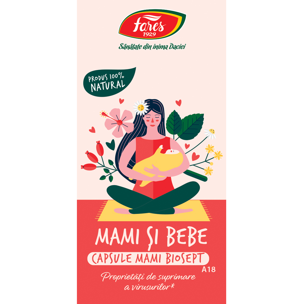 Capsulele Mami Biosept A18 Fares sunt un supliment alimentar pe baza de plante, destinat femeilor insarcinate si mamicilor care alapteaza. Formula contine extracte vegetale atent selectionate, precum lichen de piatra, maslin, echinacea, turmeric si ghimbir, contribuind la mentinerea starii generale de bine si la sustinerea functiilor normale ale organismului.