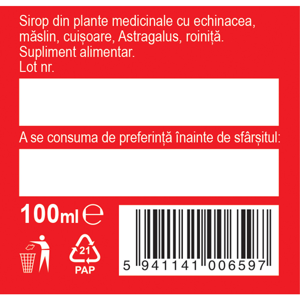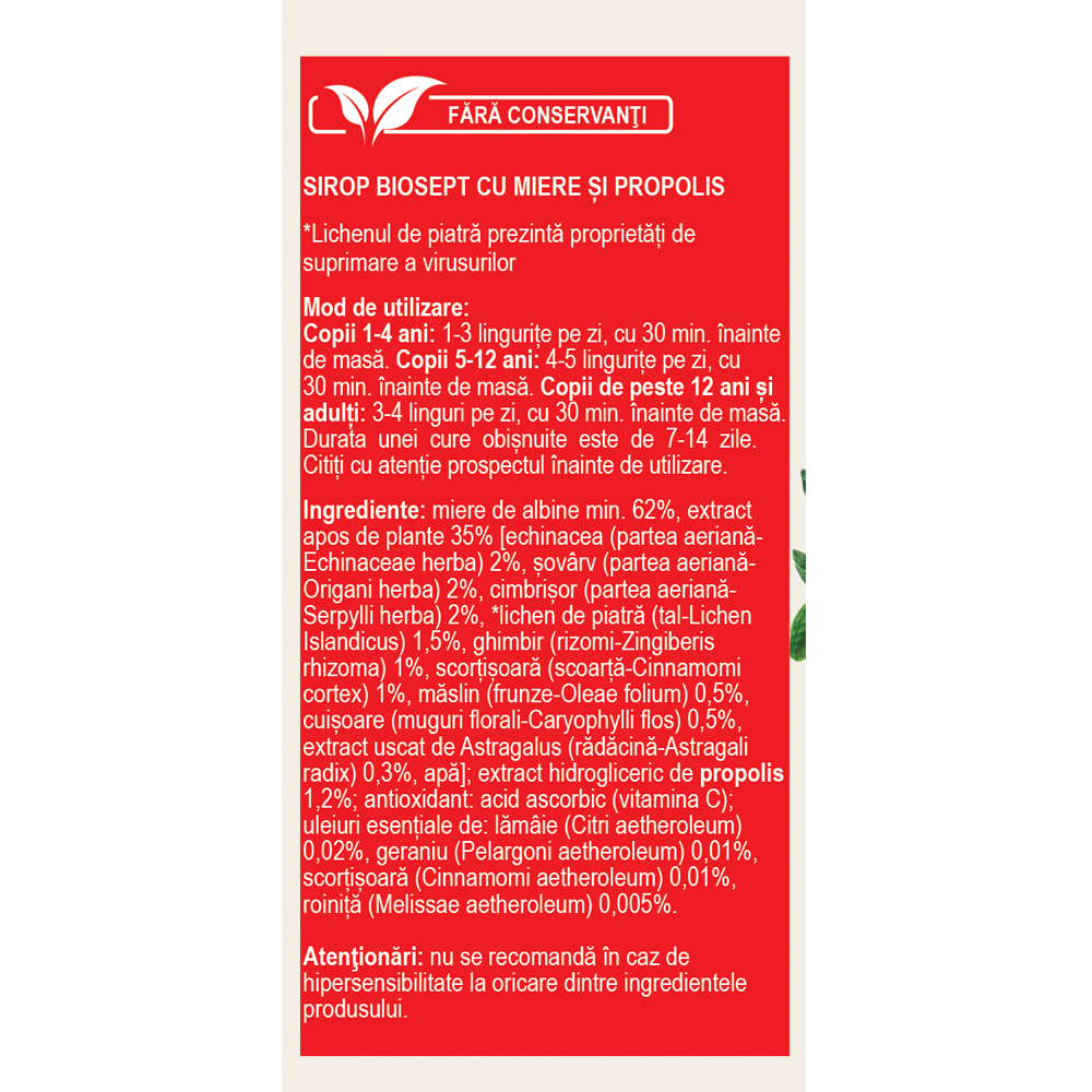 miere de albine min. 62%, extract apos de plante 35% [echinacea (echinaceae herba) 2%, sovarv (origani herba) 2%, cimbrisor (serpylli herba) 2%, lichen de piatra (lichen islandicus) 1,5%, ghimbir (zingiberis rhizoma) 1%, scortisoara (cinnamomi cortex) 1%, maslin (oleae folium) 0,5%, cuisoare (caryophylli flos) 0,5%, extract uscat de astragalus (astragali radix) 0,3%, apa], extract hidroalcoolic de propolis 1,2%, antioxidant: acid ascorbic (vitamina C), uleiuri esentiale de: lamaie (citri aetheroleum) 0,02%, geraniu (pelargoni aetheroleum) 0,01%, scortisoara (cinnamomi aetheroleum) 0,01%, roinita (melissae aetheroleum) 0,005%