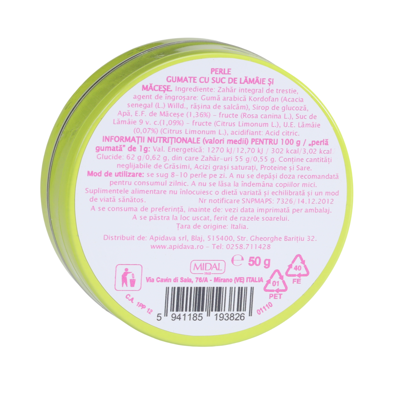 Perle gumate cu lămâie și măceșe, 50 g, Apidava sunt bomboane gumate cu gust fructat, obținute din suc de lămâie și extract de măceșe, surse naturale de vitamina C.