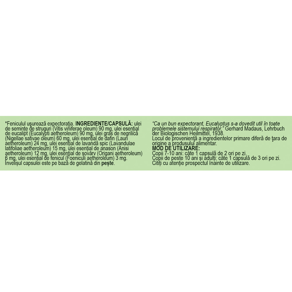 ulei de semințe de struguri (Vitis viniferae oleum) 90 mg, ulei esențial de eucalipt (Eucalypti aetheroleum) 90 mg, ulei gras de Nigella (Nigellae sativae oleum) 60 mg, ulei esențial de dafin (Lauri aetheroleum) 24 mg, ulei esențial de lavandă spic (Lavandulae latifoliae aetheroleum) 15 mg, ulei esențial de anason (Anisi aetheroleum) 12 mg, ulei esențial de șovârv (Origani aetheroleum) 6 mg, ulei esențial de fenicul (Foeniculi aetheroleum) 3 mg.