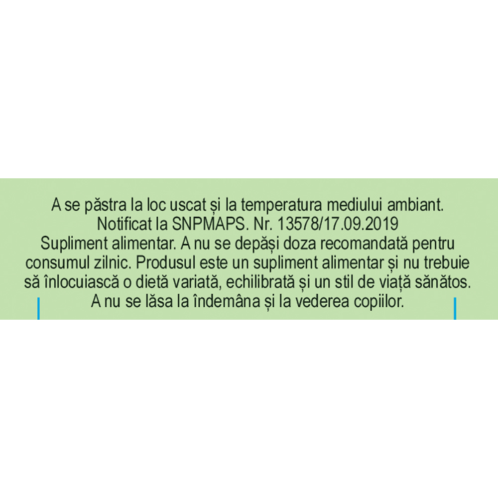 A nu se depăși doza recomandată pentru consumul zilnic. Produsul este un supliment alimentar și nu trebuie să înlocuiască o dietă variată, echilibrată și un stil de viață sănătos. A se păstra la loc uscat, la temperatura mediului ambiant și a nu se lăsa la îndemâna și la vederea copiilor mici.
