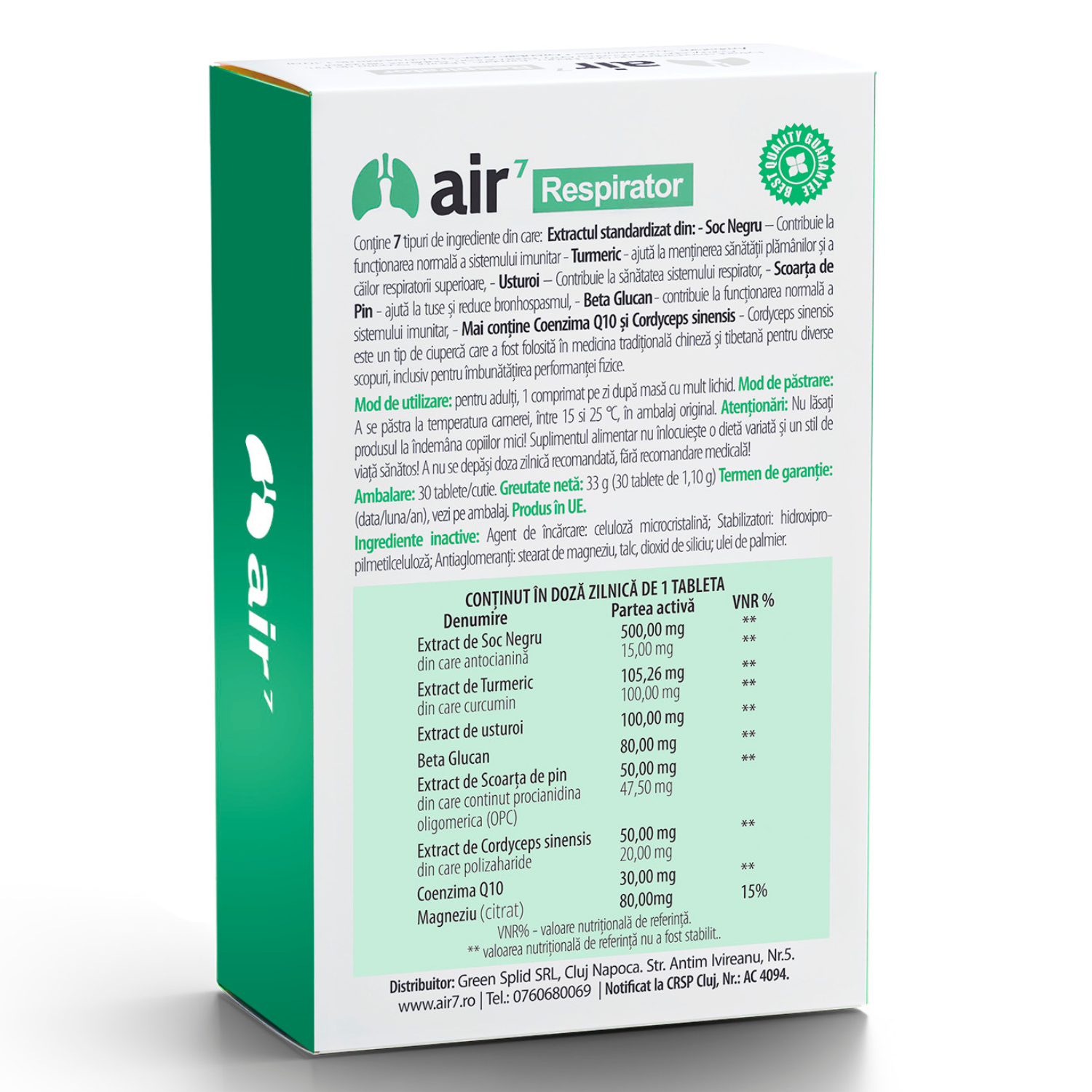 Air7 Respirator este un supliment alimentar complex, bazat pe 7 ingrediente active naturale cu beneficii dovedite asupra sănătății plămânilor și a căilor respiratorii. Formula sa combină extracte standardizate din plante cu acțiune antiinflamatoare, antioxidantă, antivirală și expectorantă, oferind sprijin eficient în afecțiuni respiratorii acute și cronice. Air7 Respirator contribuie la o respirație ușoară și la protecția sistemului imunitar.