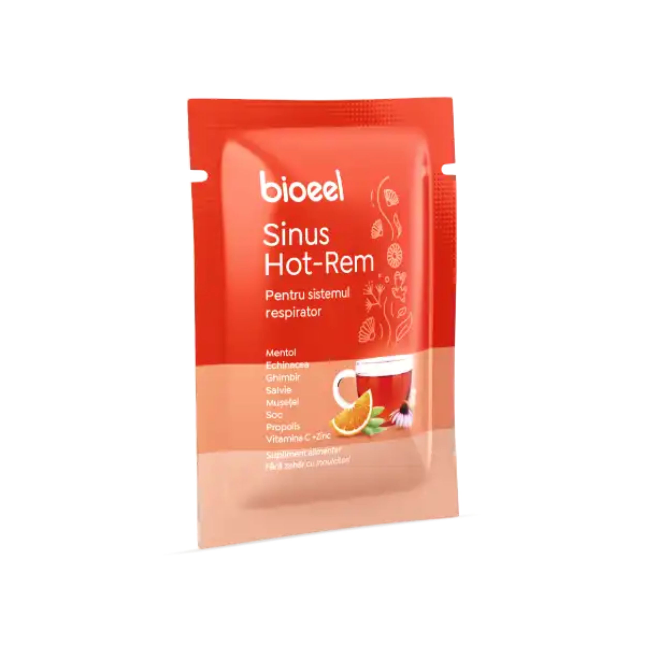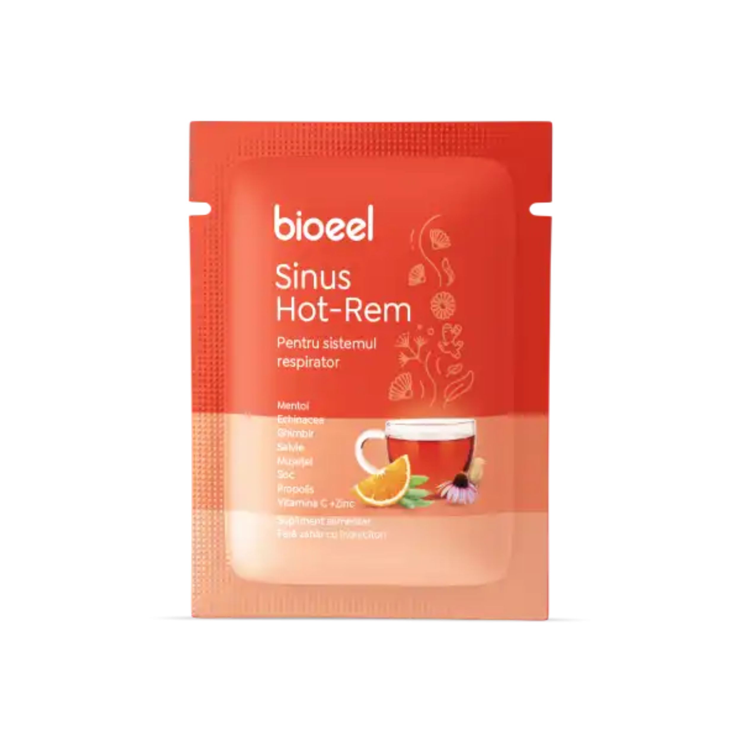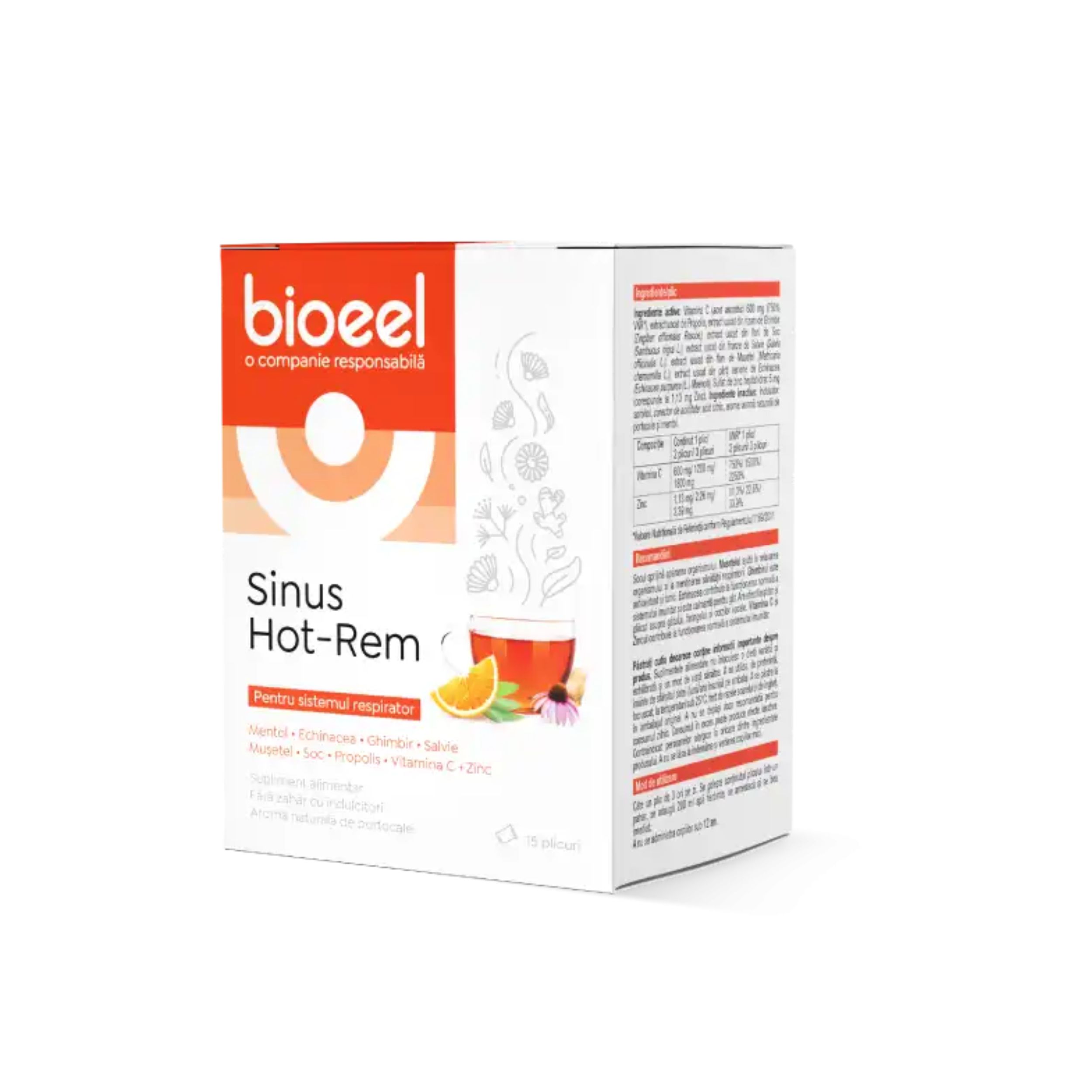 Vitamina C (acid ascorbic) 600 mg (750% VNR*), extract uscat de Propolis, extract uscat din rizom de Ghimbir (Zingiber officinalis Roscoe), extract uscat din flori de Soc (Sambucus nigra L.), extract uscat din frunze de Salvie (Salvia officinalis L.), extract uscat din flori de Mușețel (Matricaria chamomilla L.), extract uscat din părți aeriene de Echinacea (Echinacea purpurea (L.) Moench), Sulfat de zinc heptahidrat 5 mg (corespunde la 1,13 mg Zinc)
